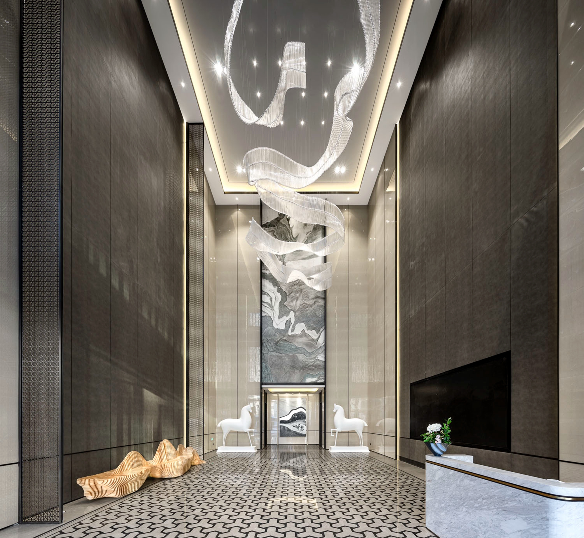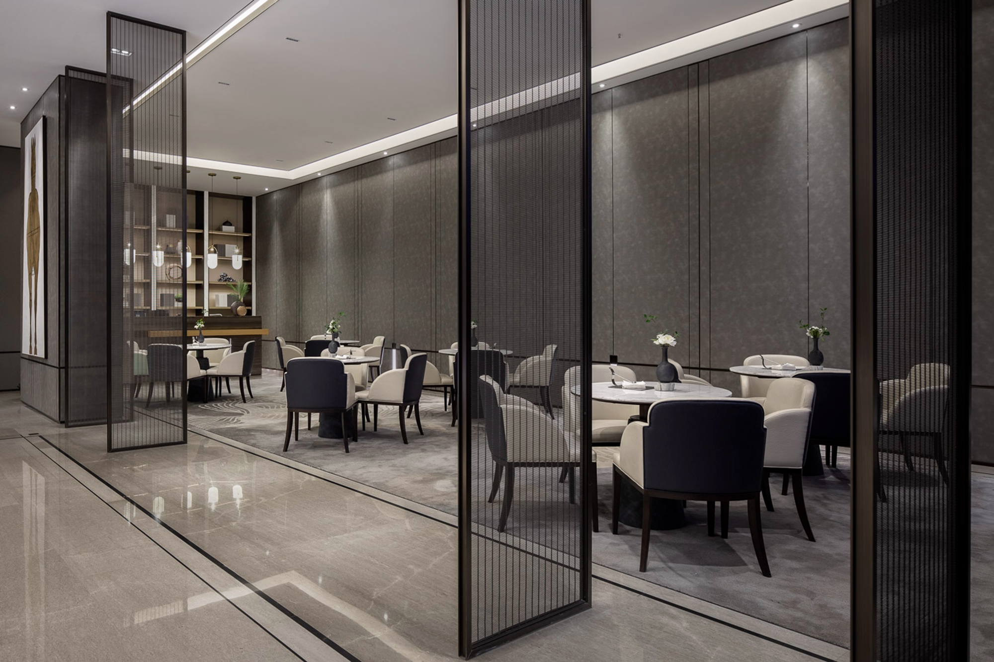 空间意境:通过营造氛围来提升整体空间内涵,以恰到好处的色彩与精炼的线条构建出现代东方美学韵律空间。