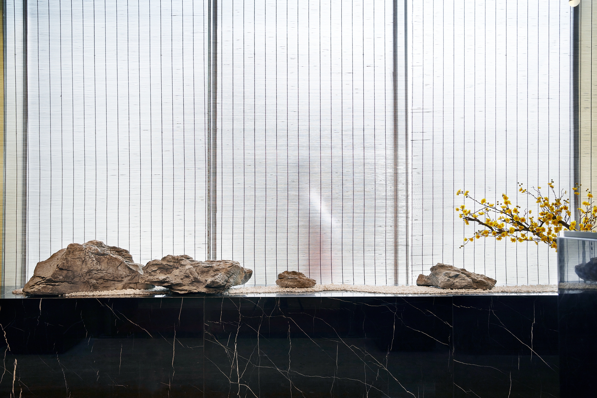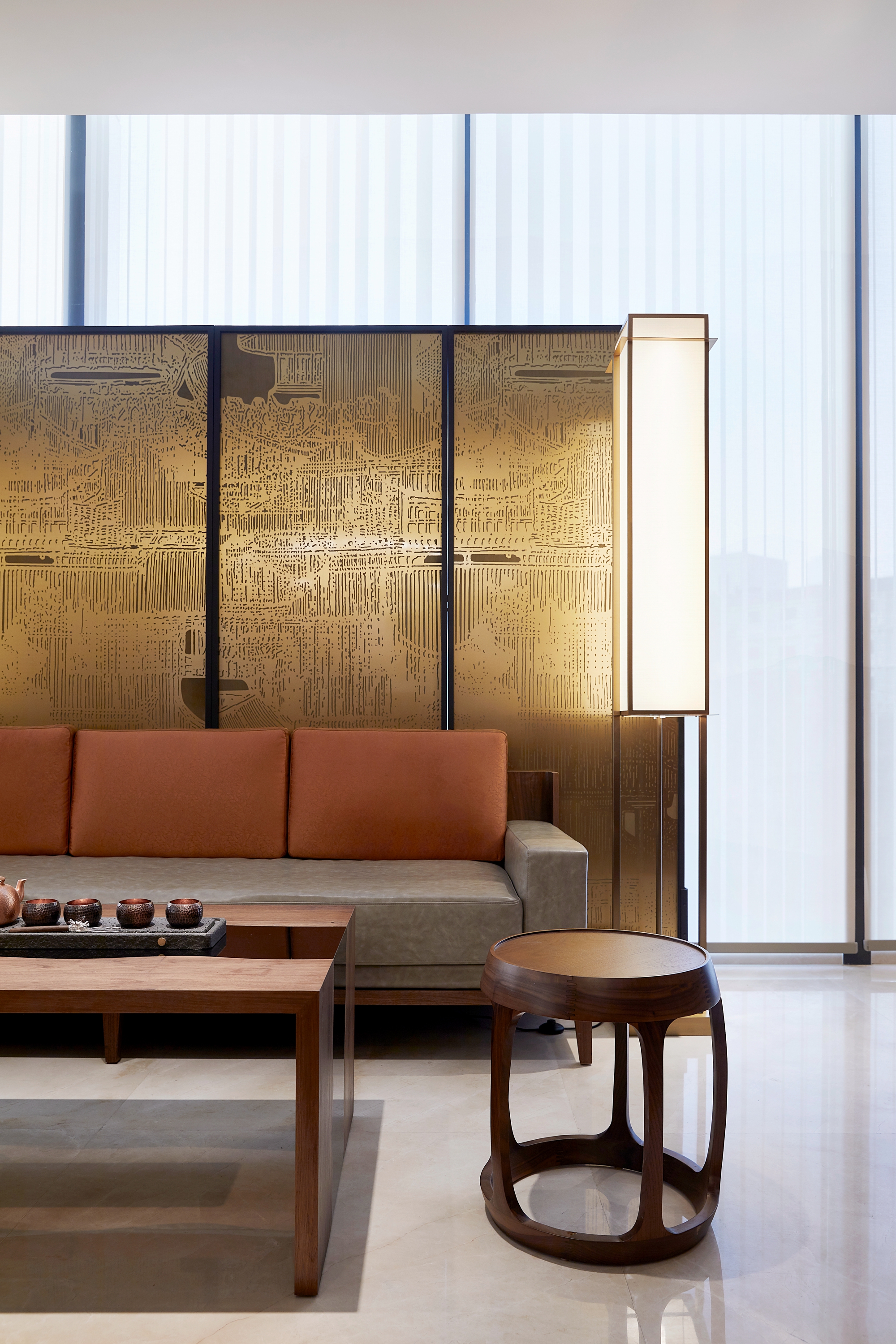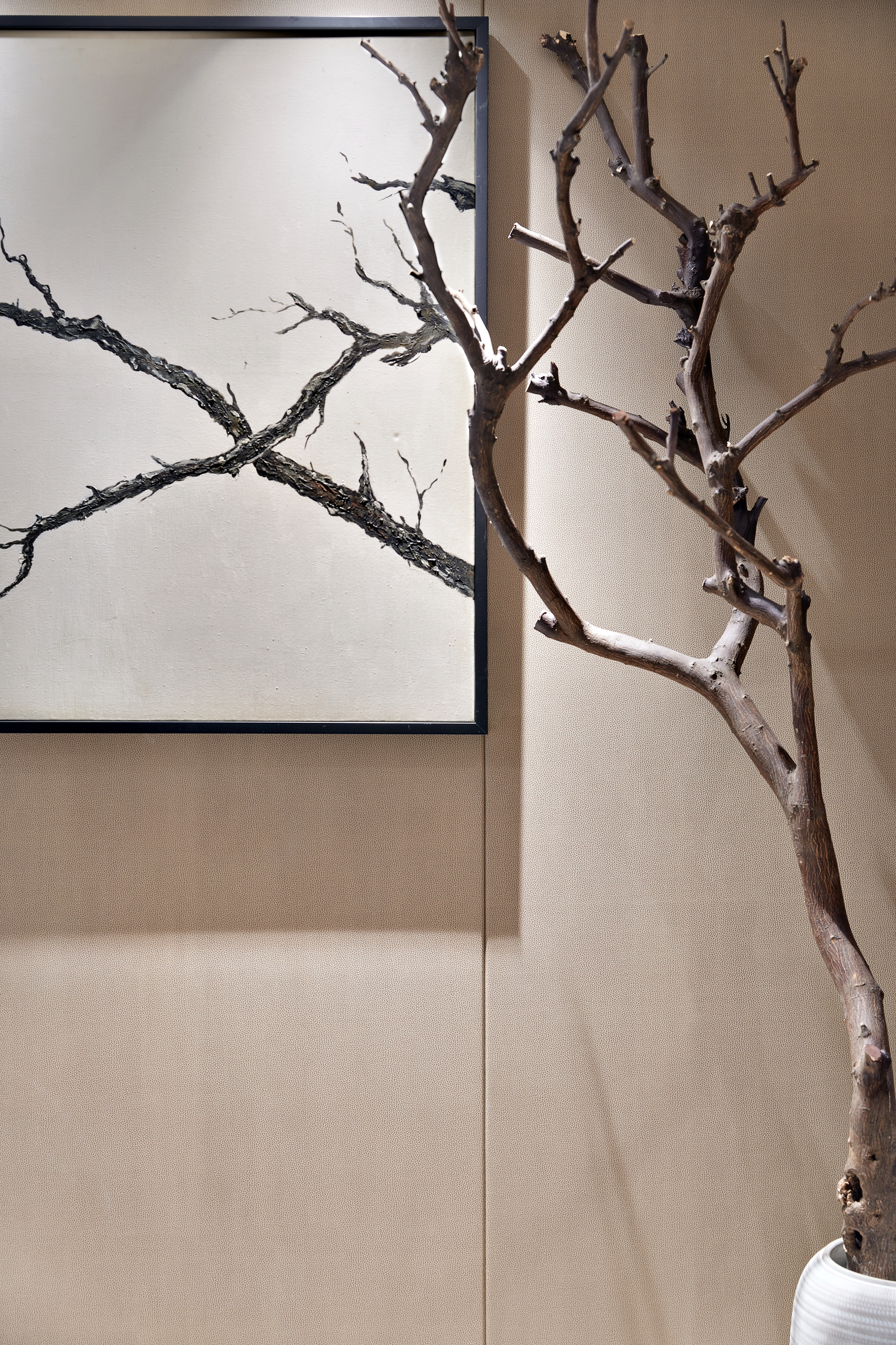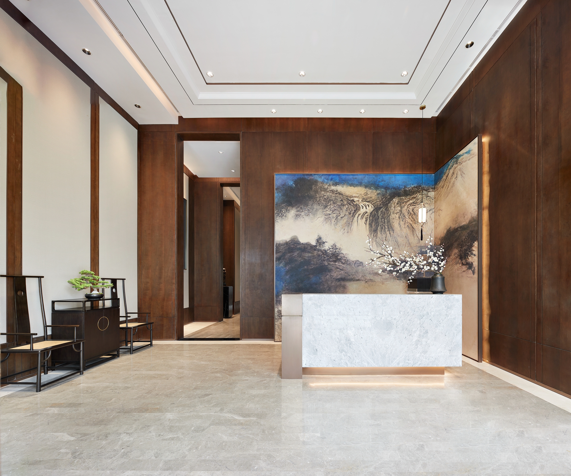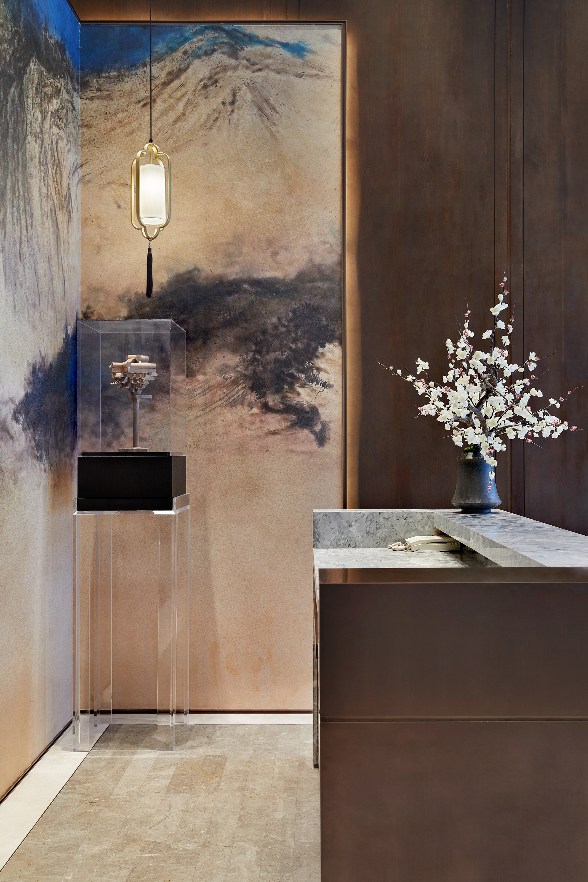 古老的仪式感从入门开始,双重门以递进关系营造“出则繁华,入则静谧”的空间格局。空间规划遵循中轴对称的格局,承袭传统建筑精髓。接待大厅的屏风题材源自张大千《泼墨山水》,主体部分为巍峨高耸的山体,高山仰止,壮气夺人,寓意寄情山水的写意生活。