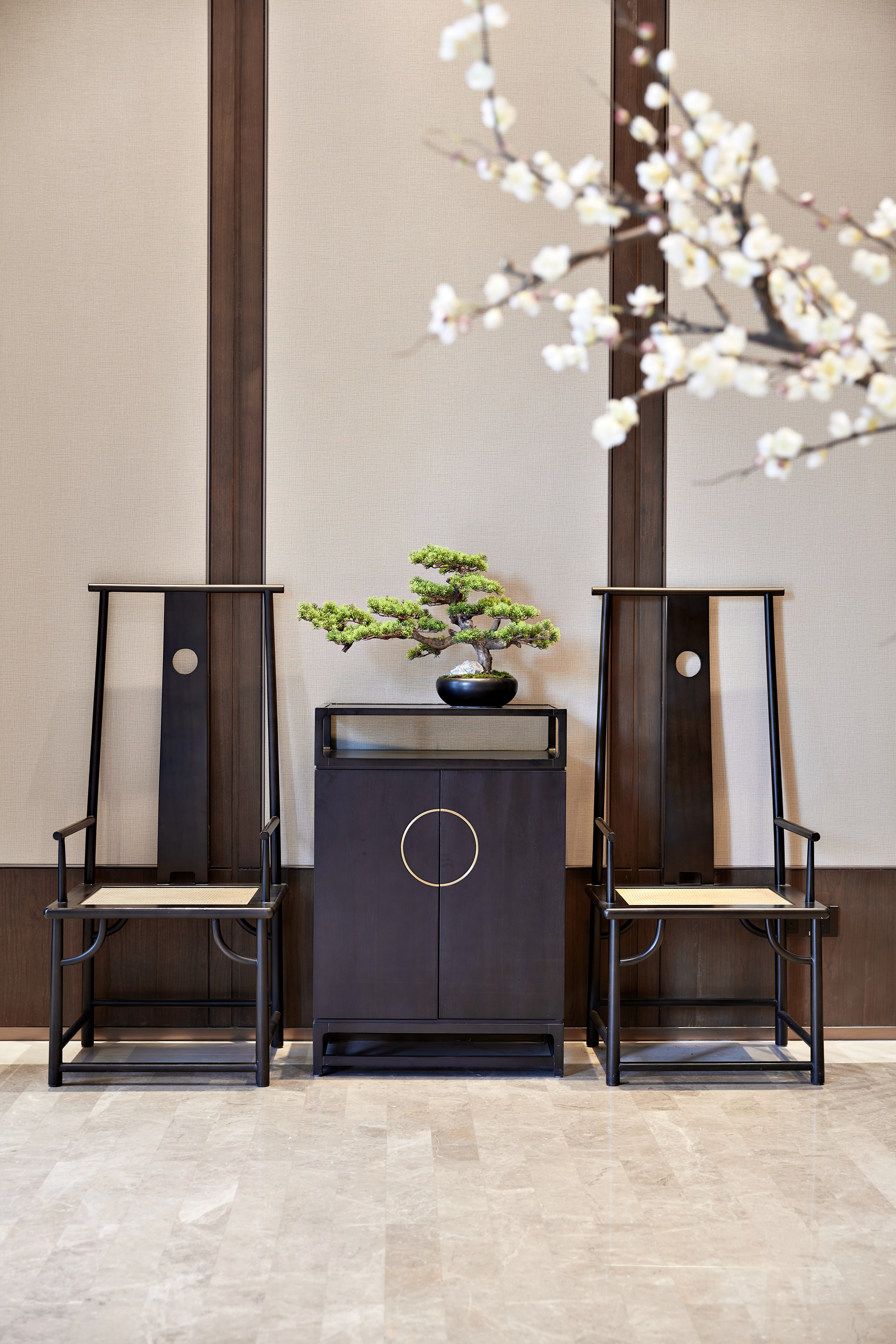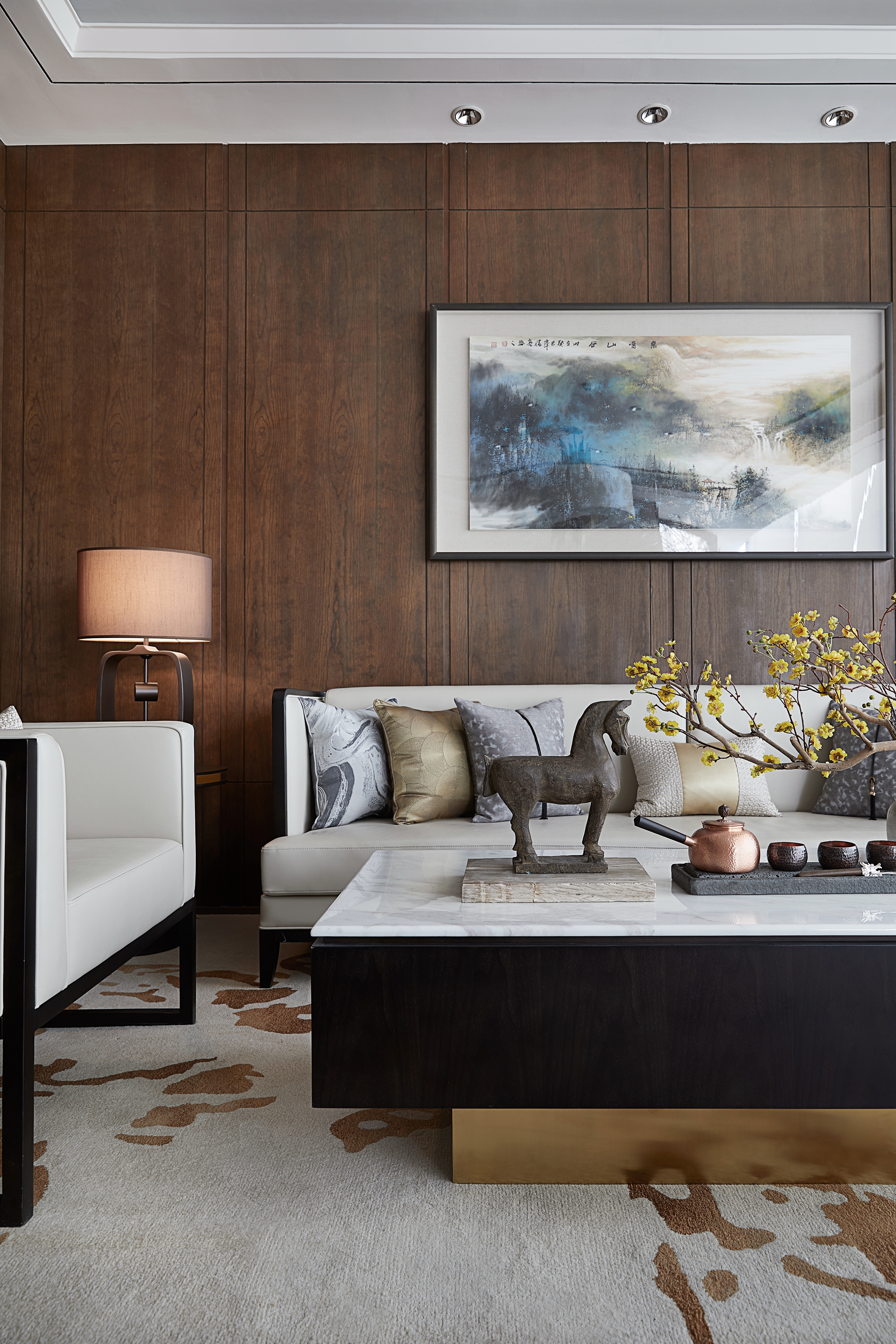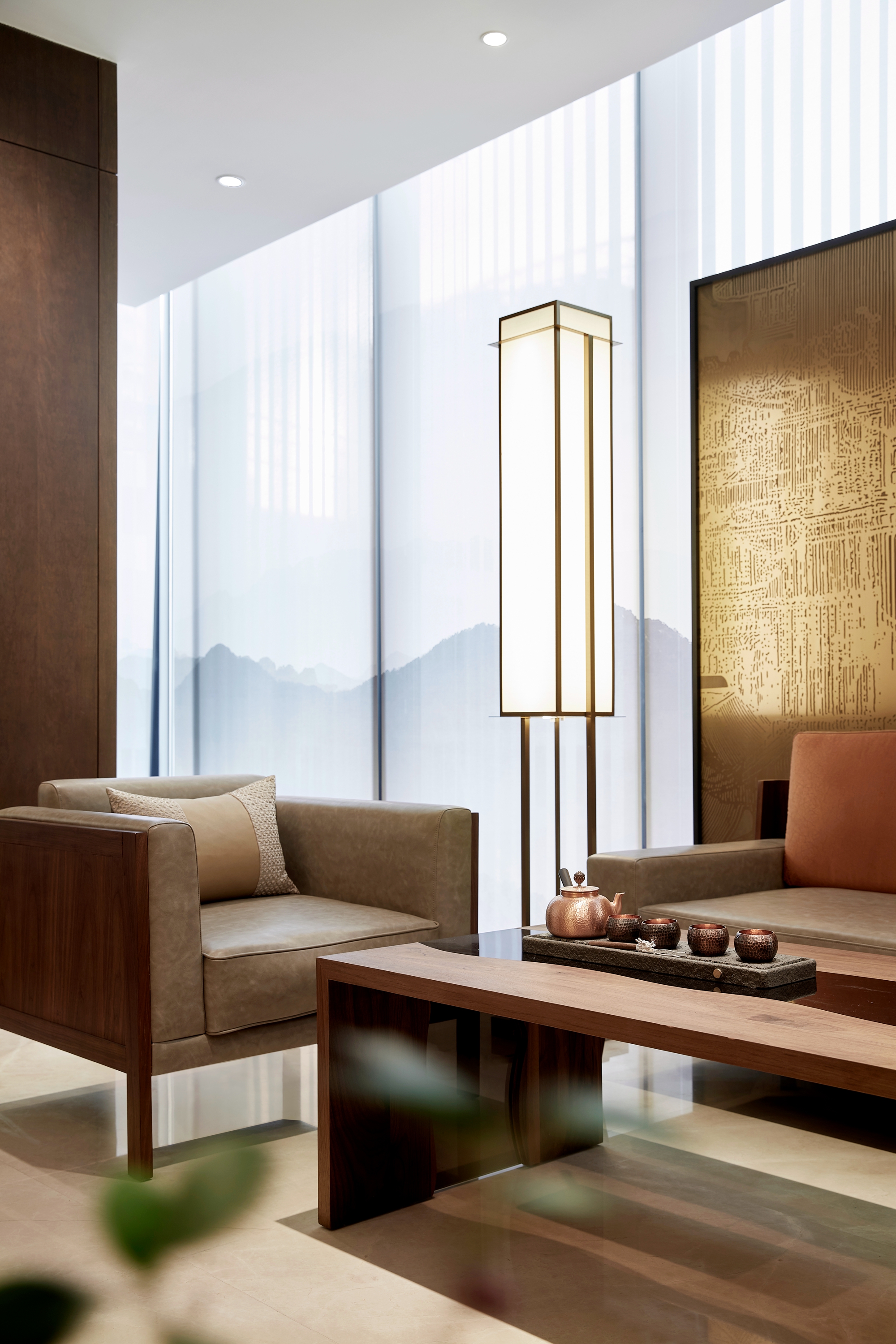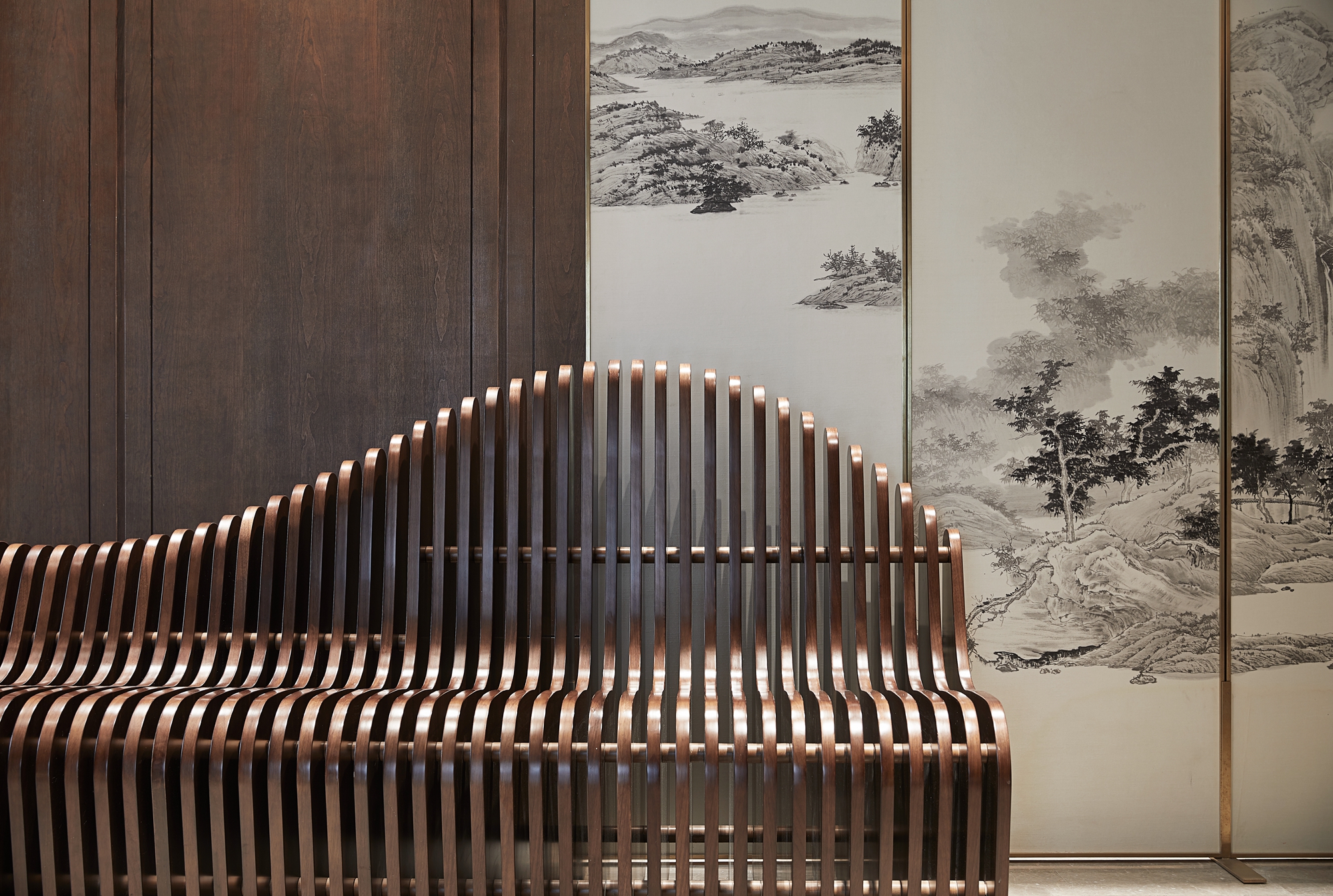 古老的仪式感从入门开始,双重门以递进关系营造“出则繁华,入则静谧”的空间格局。空间规划遵循中轴对称的格局,承袭传统建筑精髓。接待大厅的屏风题材源自张大千《泼墨山水》,主体部分为巍峨高耸的山体,高山仰止,壮气夺人,寓意寄情山水的写意生活。
