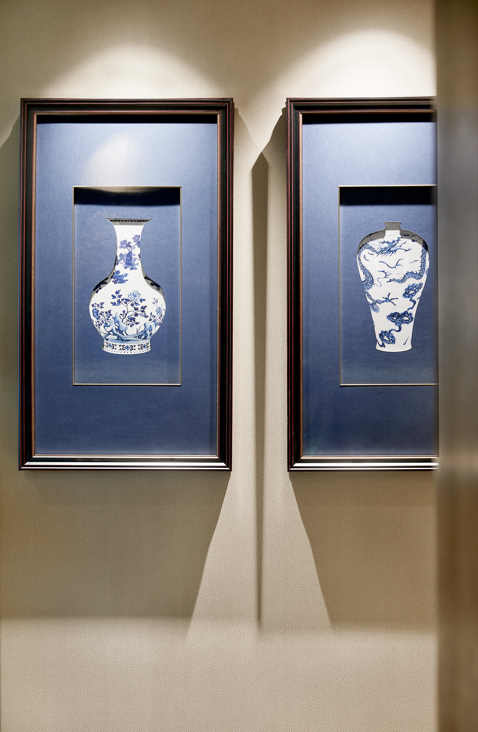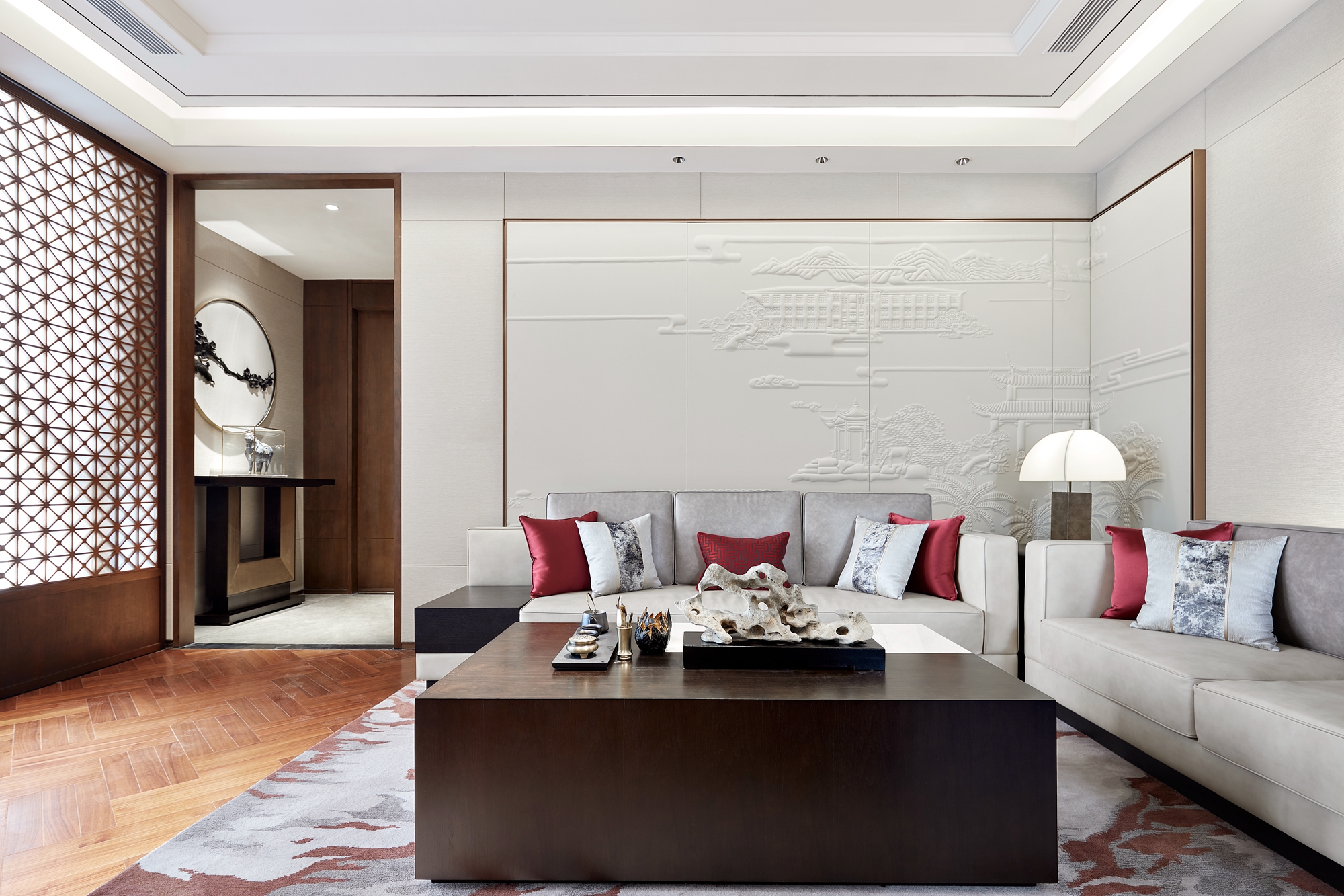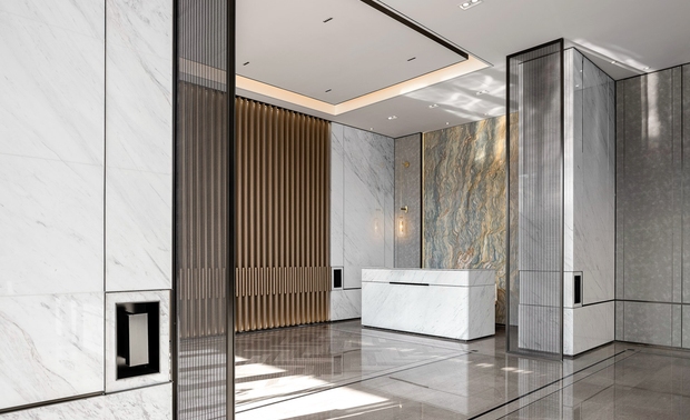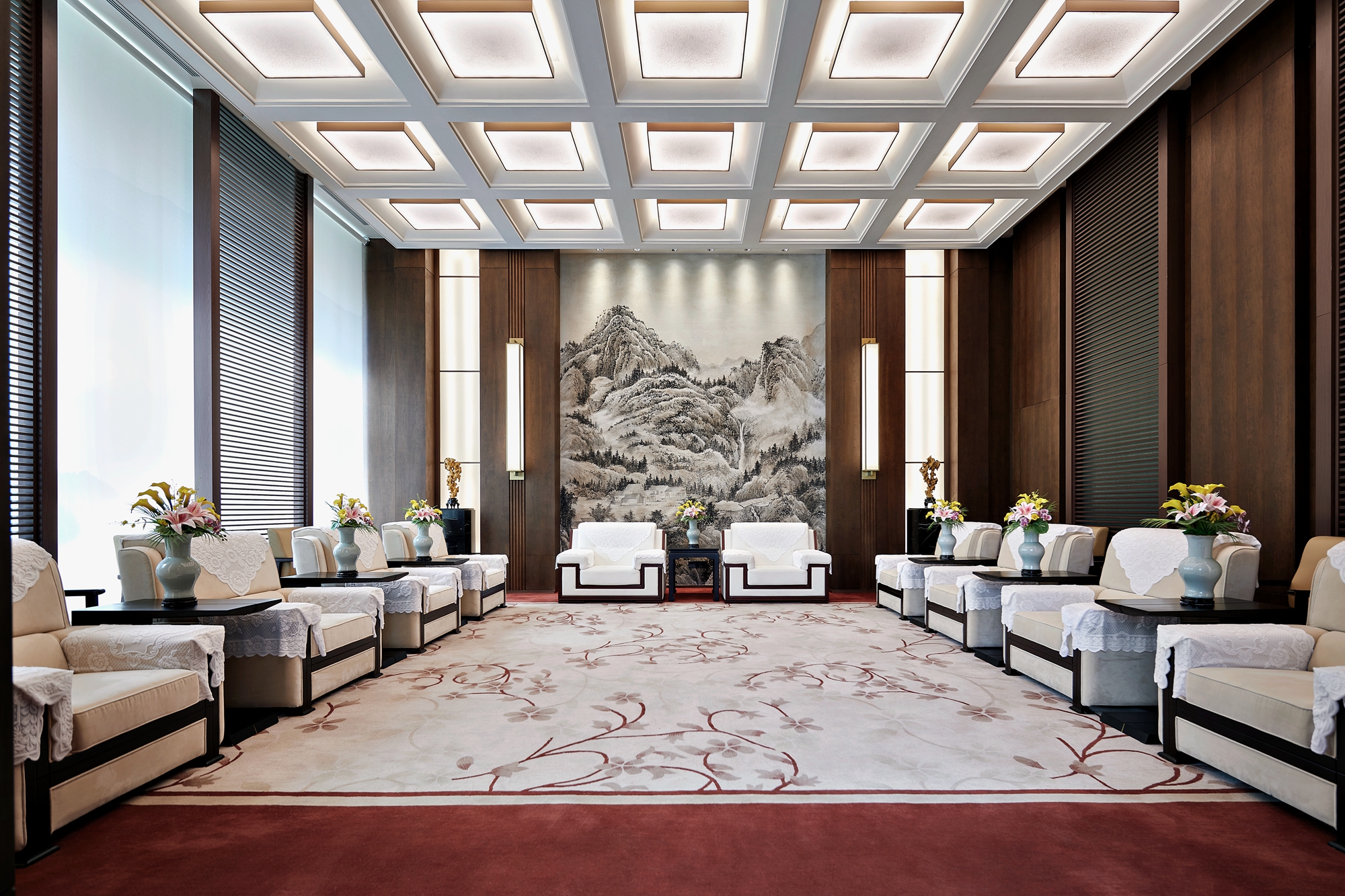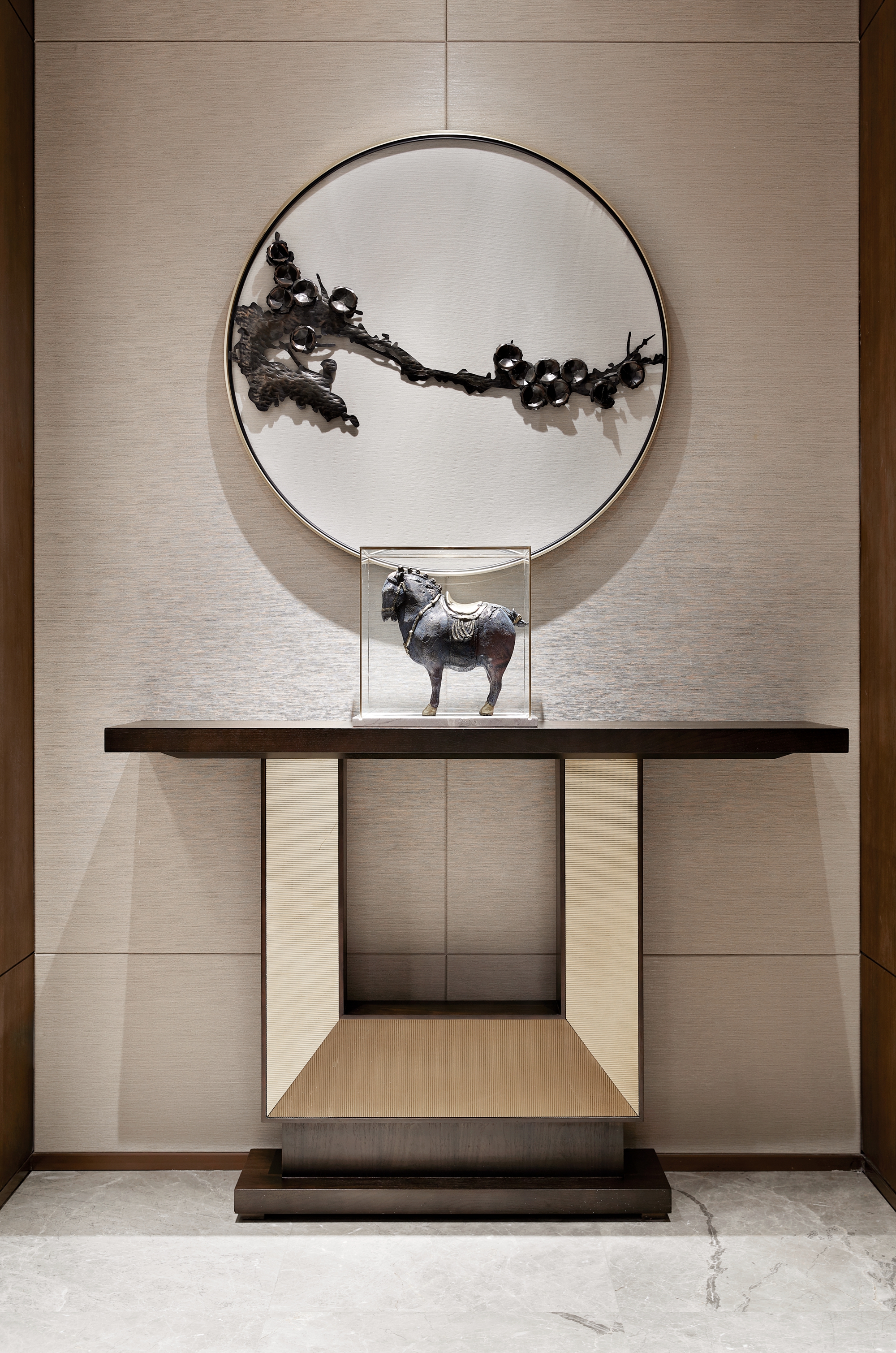 古老的仪式感从入门开始,双重门以递进关系营造“出则繁华,入则静谧”的空间格局。空间规划遵循中轴对称的格局,承袭传统建筑精髓。接待大厅的屏风题材源自张大千《泼墨山水》,主体部分为巍峨高耸的山体,高山仰止,壮气夺人,寓意寄情山水的写意生活。