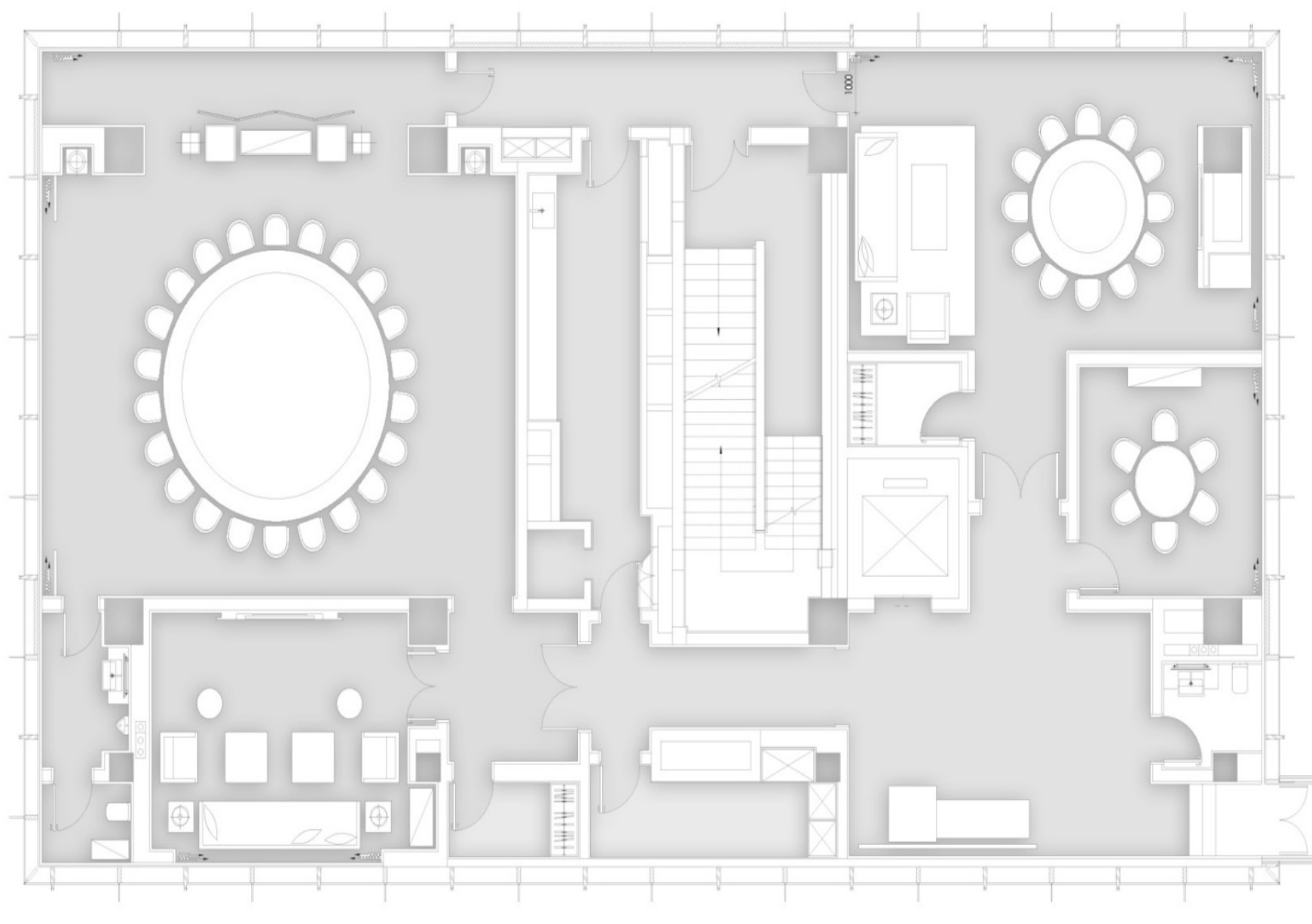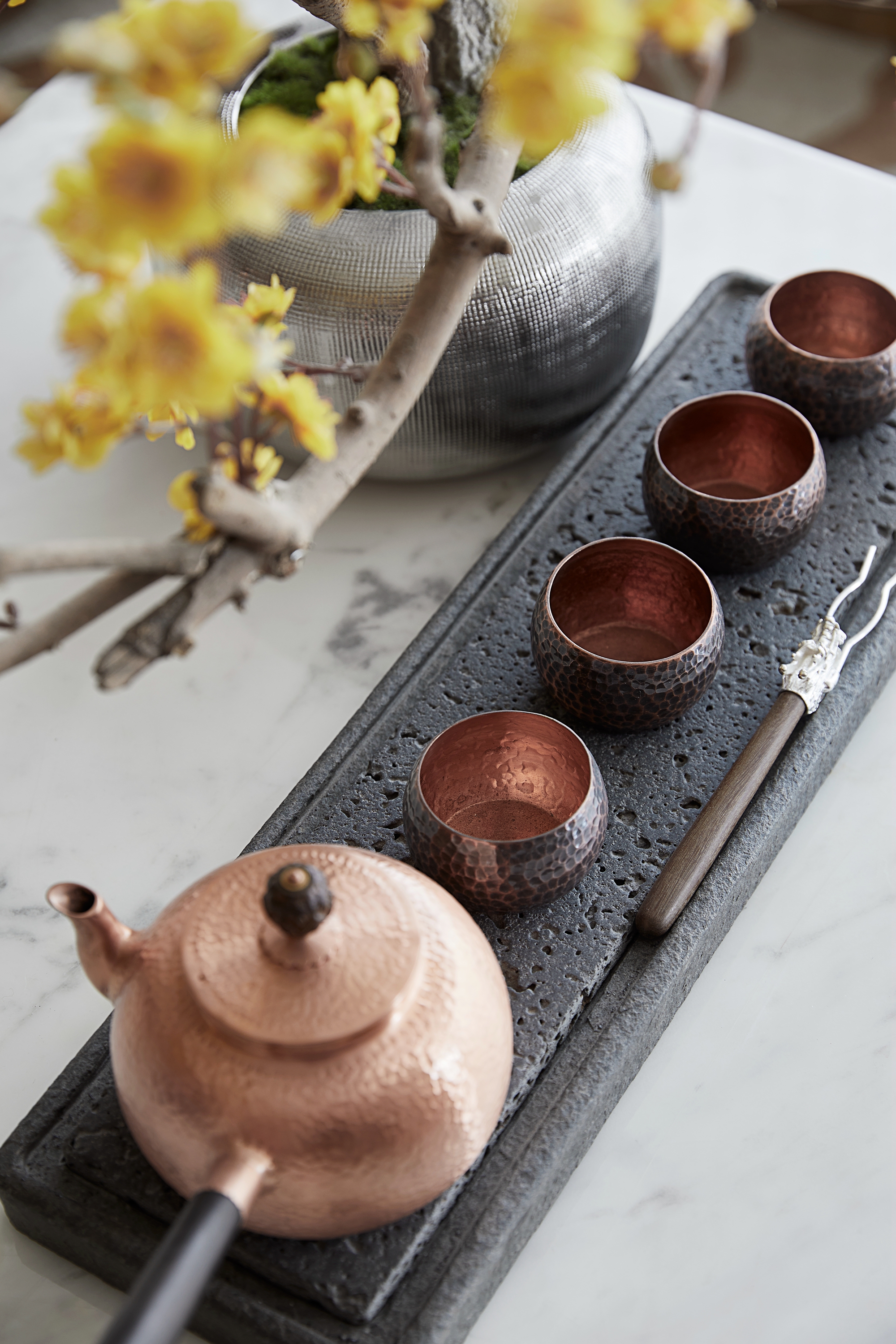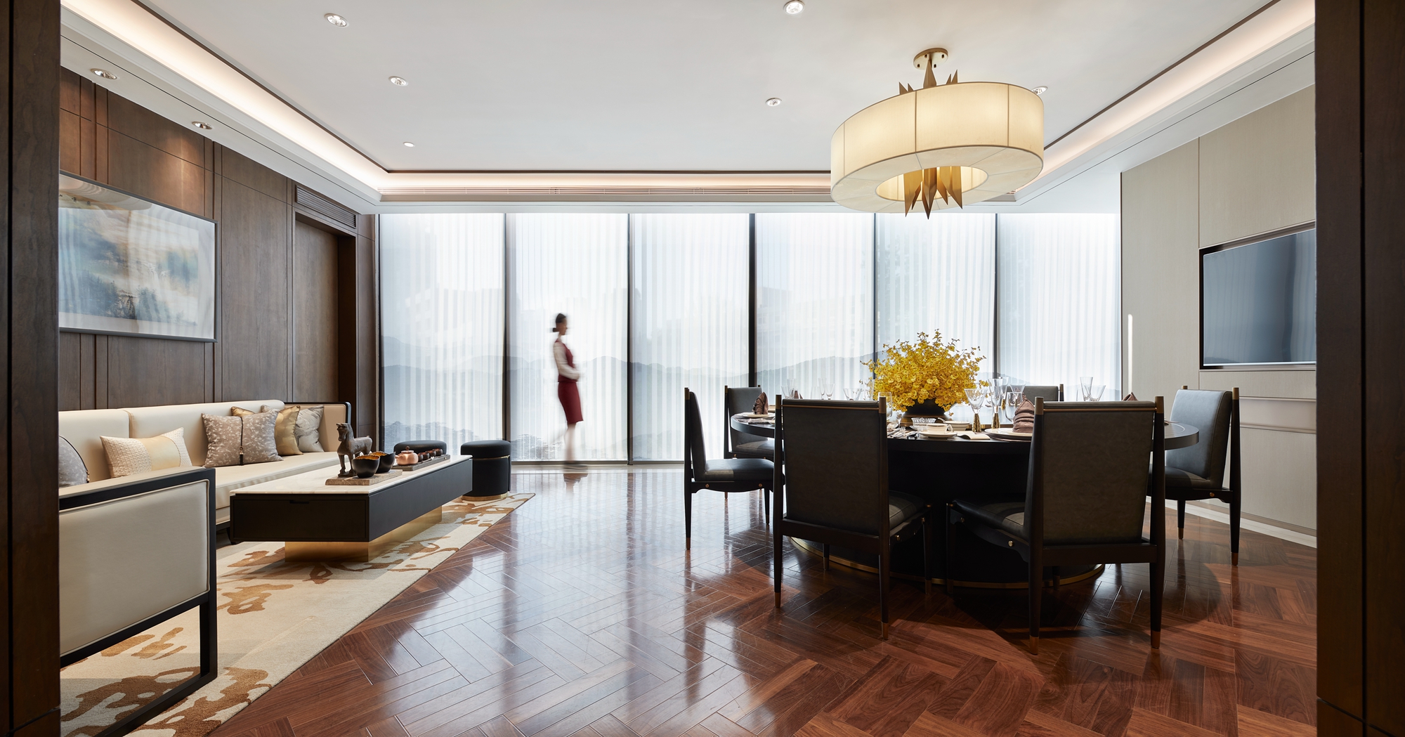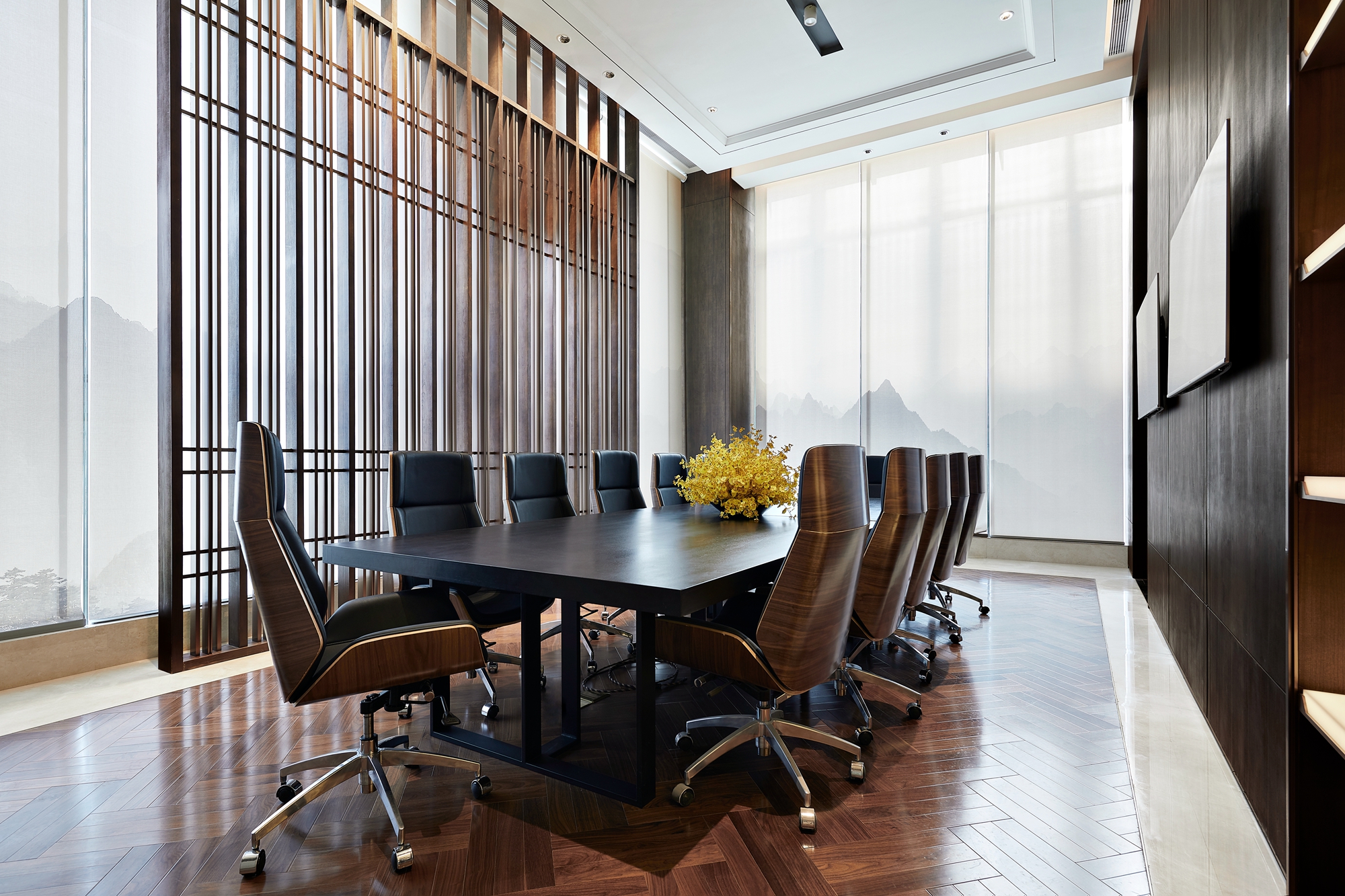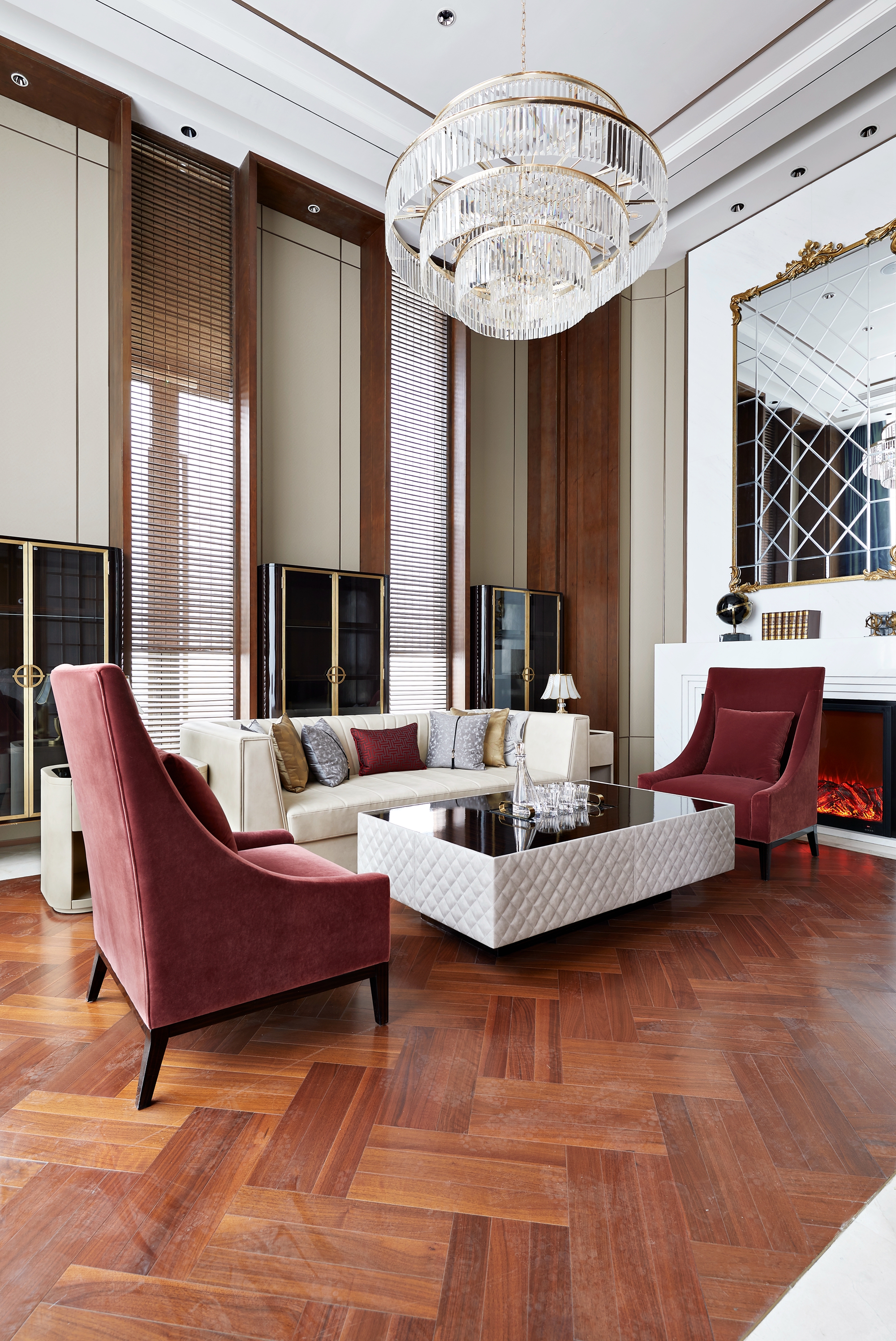 古老的仪式感从入门开始,双重门以递进关系营造“出则繁华,入则静谧”的空间格局。空间规划遵循中轴对称的格局,承袭传统建筑精髓。接待大厅的屏风题材源自张大千《泼墨山水》,主体部分为巍峨高耸的山体,高山仰止,壮气夺人,寓意寄情山水的写意生活。