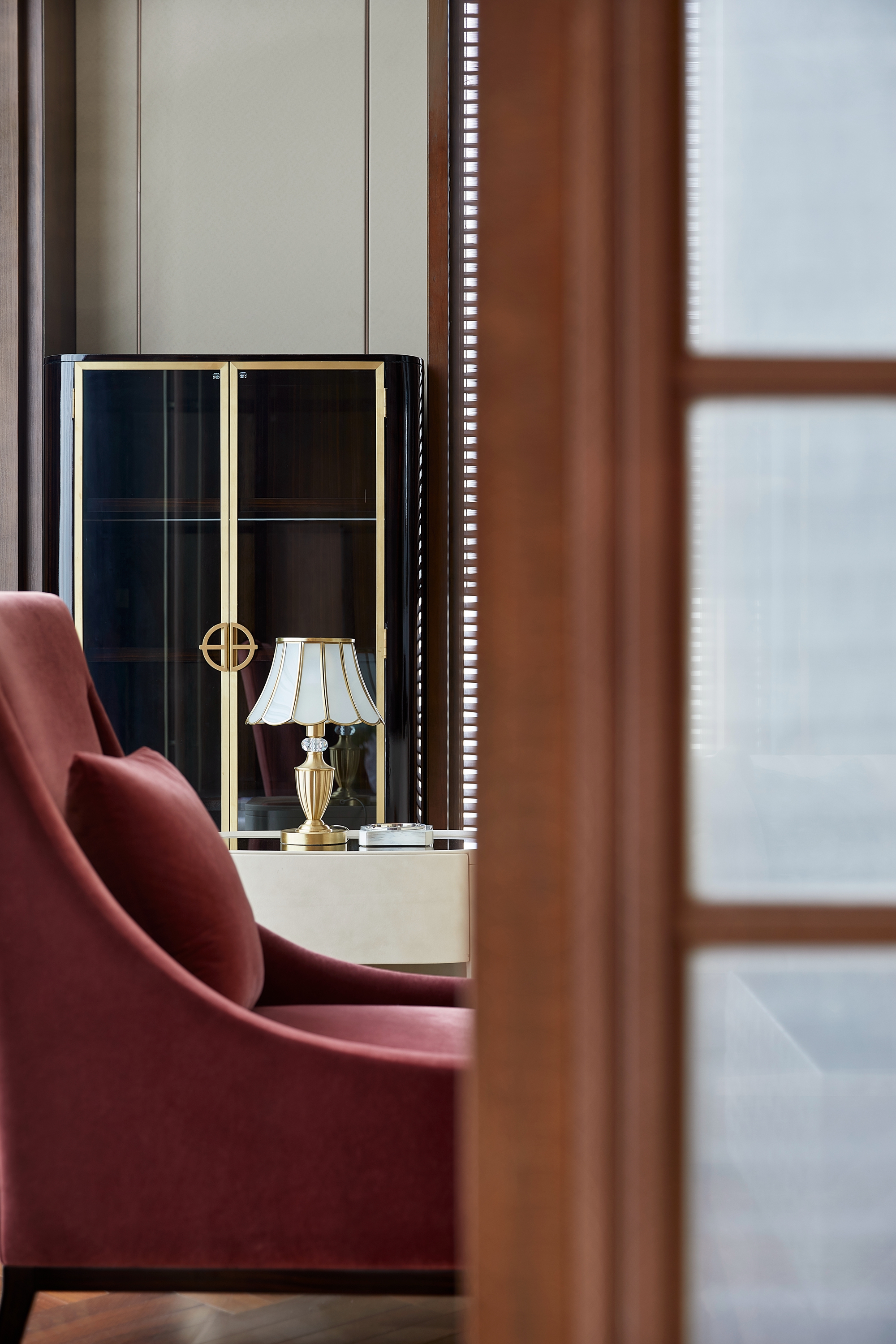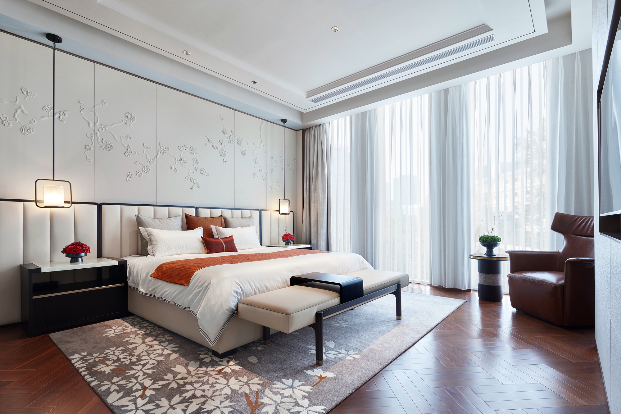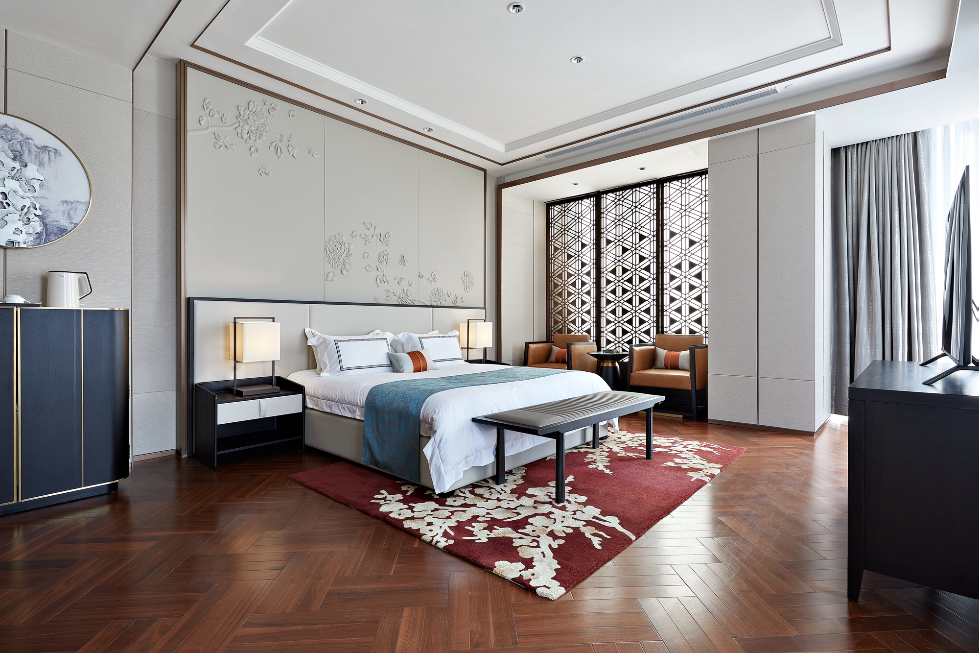 设计师以不凡的空间场景布置,室内真正的奢华不是流于表面,而是每个细节都经得起推敲。随着光影观赏天花背景之时,仿佛尘缘中琴声,月皎波澄。心旷神怡之际,耳边一阵微风忽起伏。悠悠扬扬,一种情韵却是令人回肠荡气。东方审美与情趣在视线延伸中娓娓道来,步移景异。客房中恰到好处的那抹红色很好的体现出淡妆浓抹总相宜的意境
