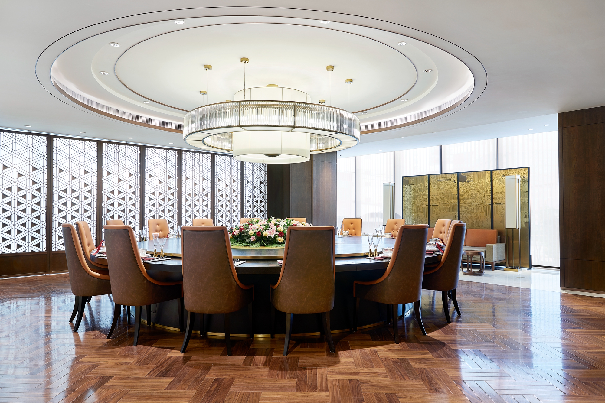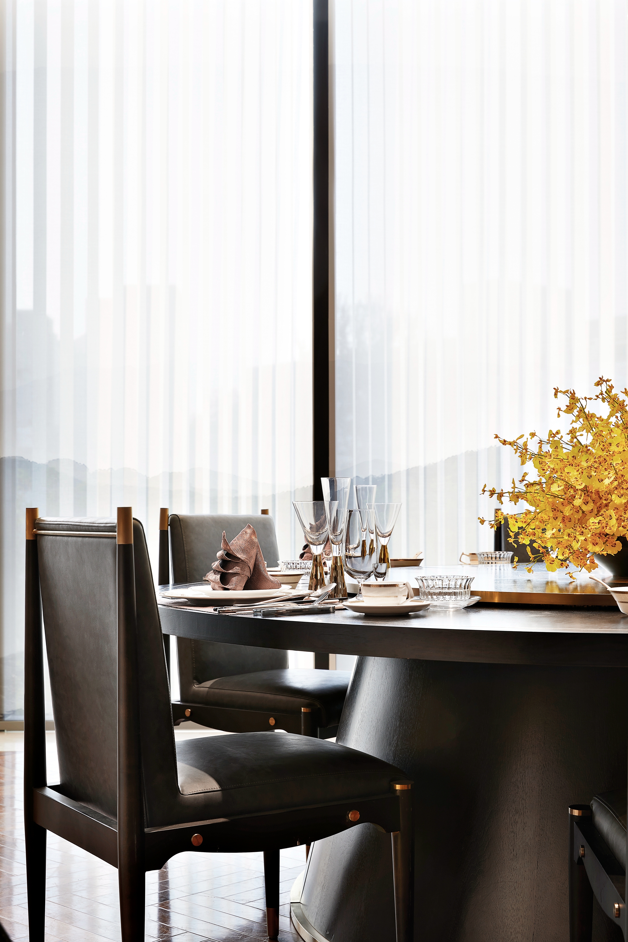 餐厅内意蕴却是连接古今的一抹浮影,载着千年以来的生活之美。空间尺度的变化也追随这一逻辑,背景墙独有木窗格栅,组成可赏内景,配合软装的布景,很好体现禅意会所静雅气韵和地域本先文化的归属。