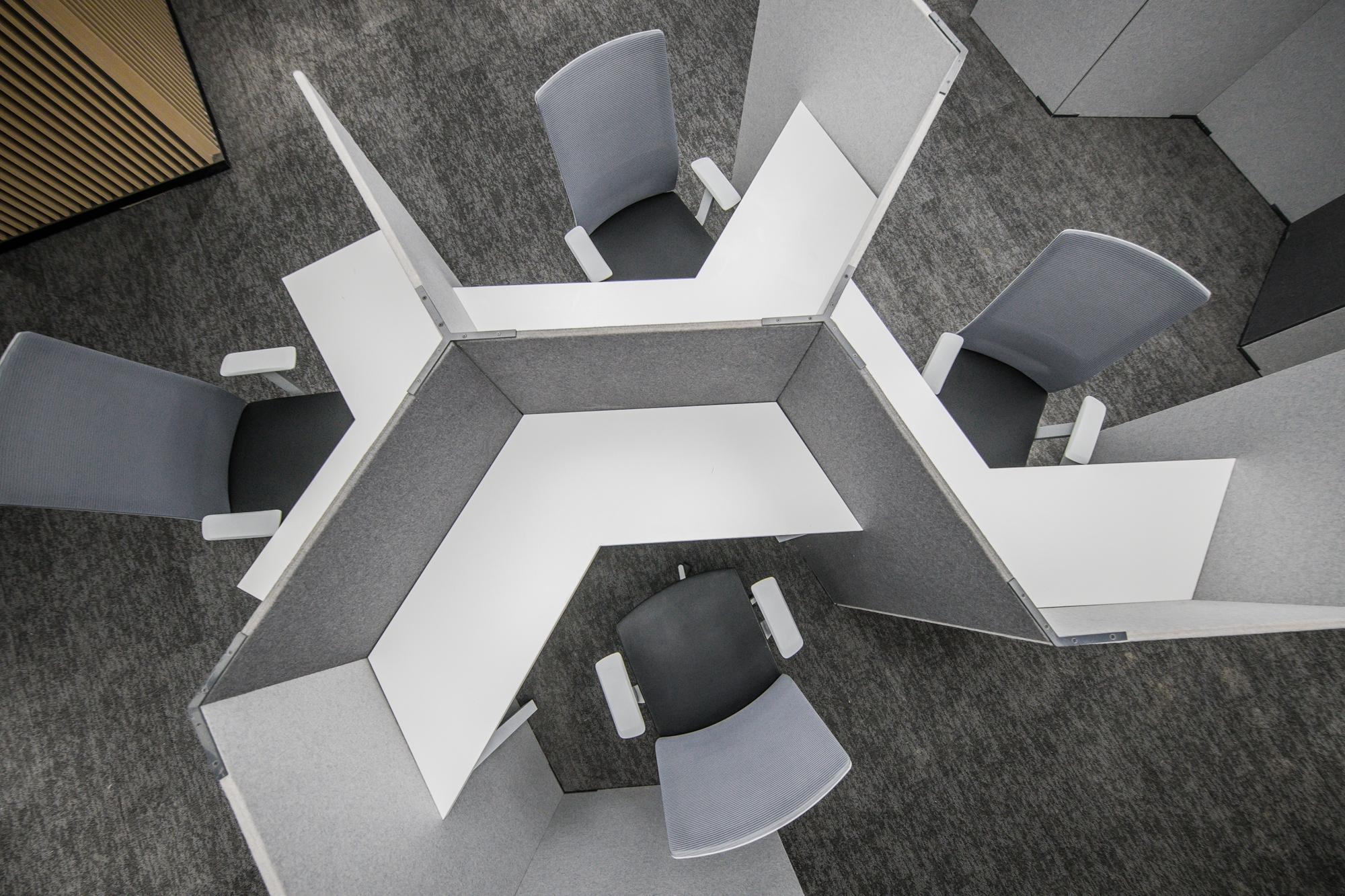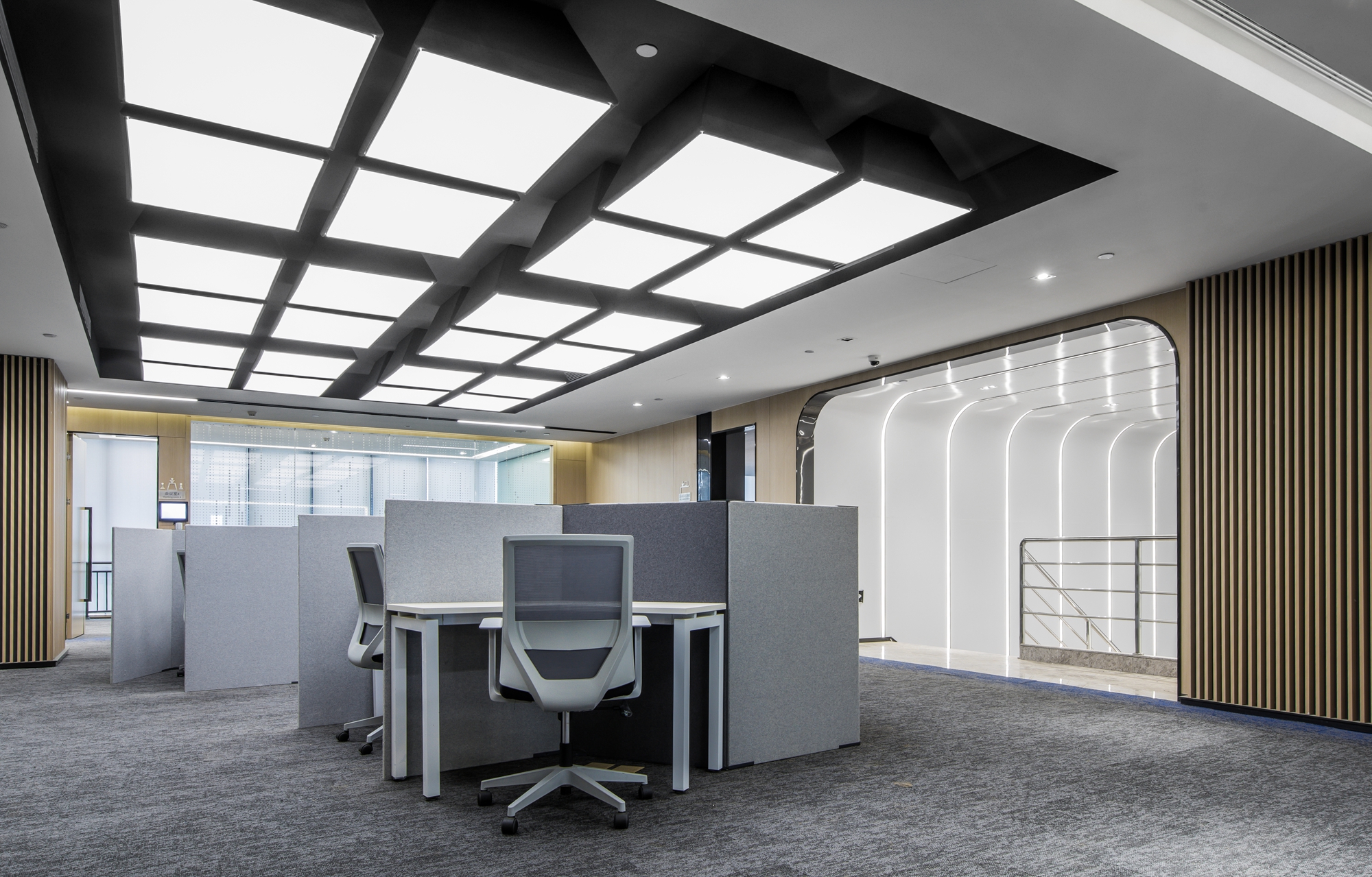 结合功能和形体,打造出错落有致的光影空间。自由组合的办公形式随机散落在空间之中,并结合顶面分子流式造型灯把整个空间贯穿起来。 -