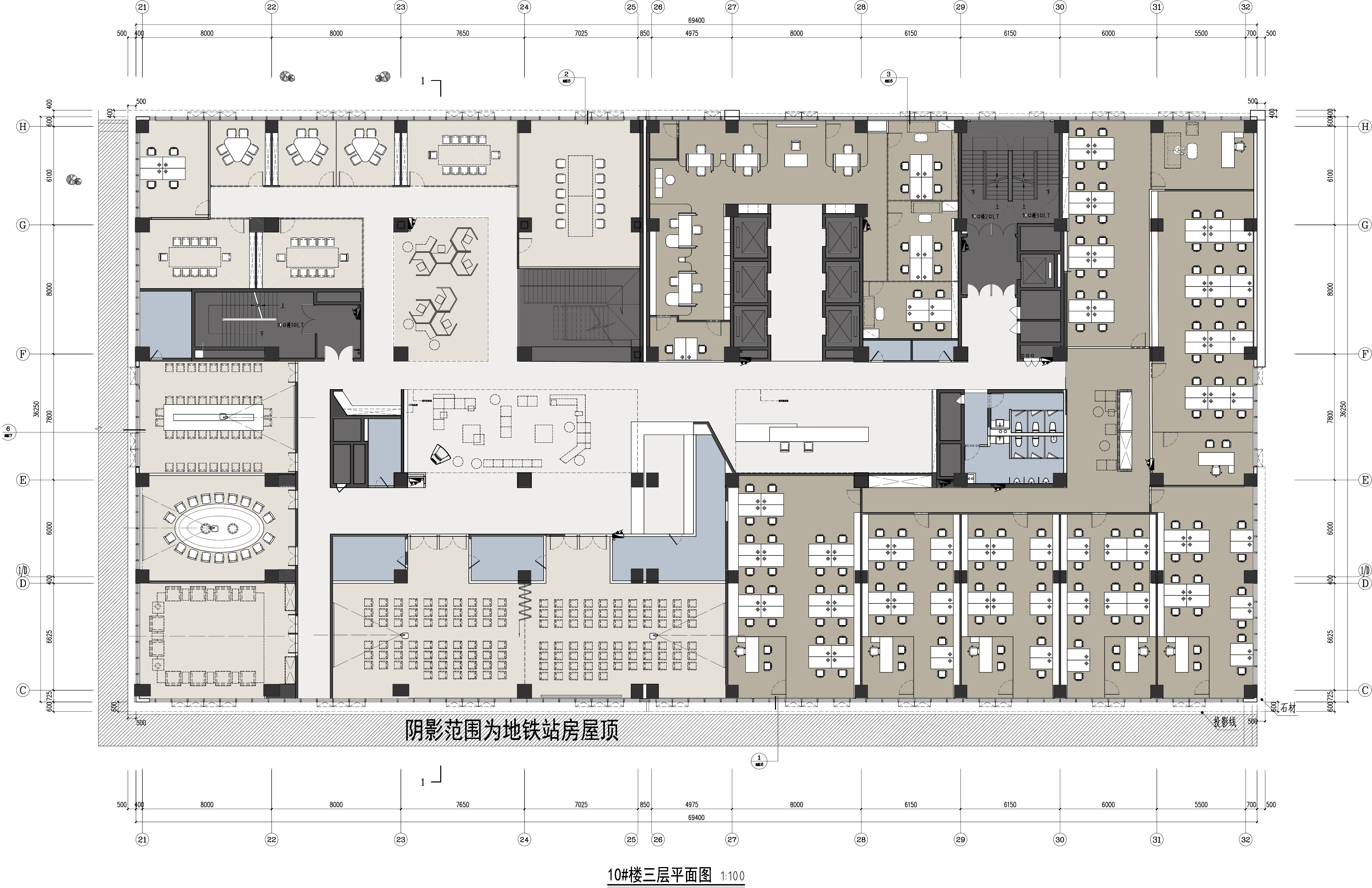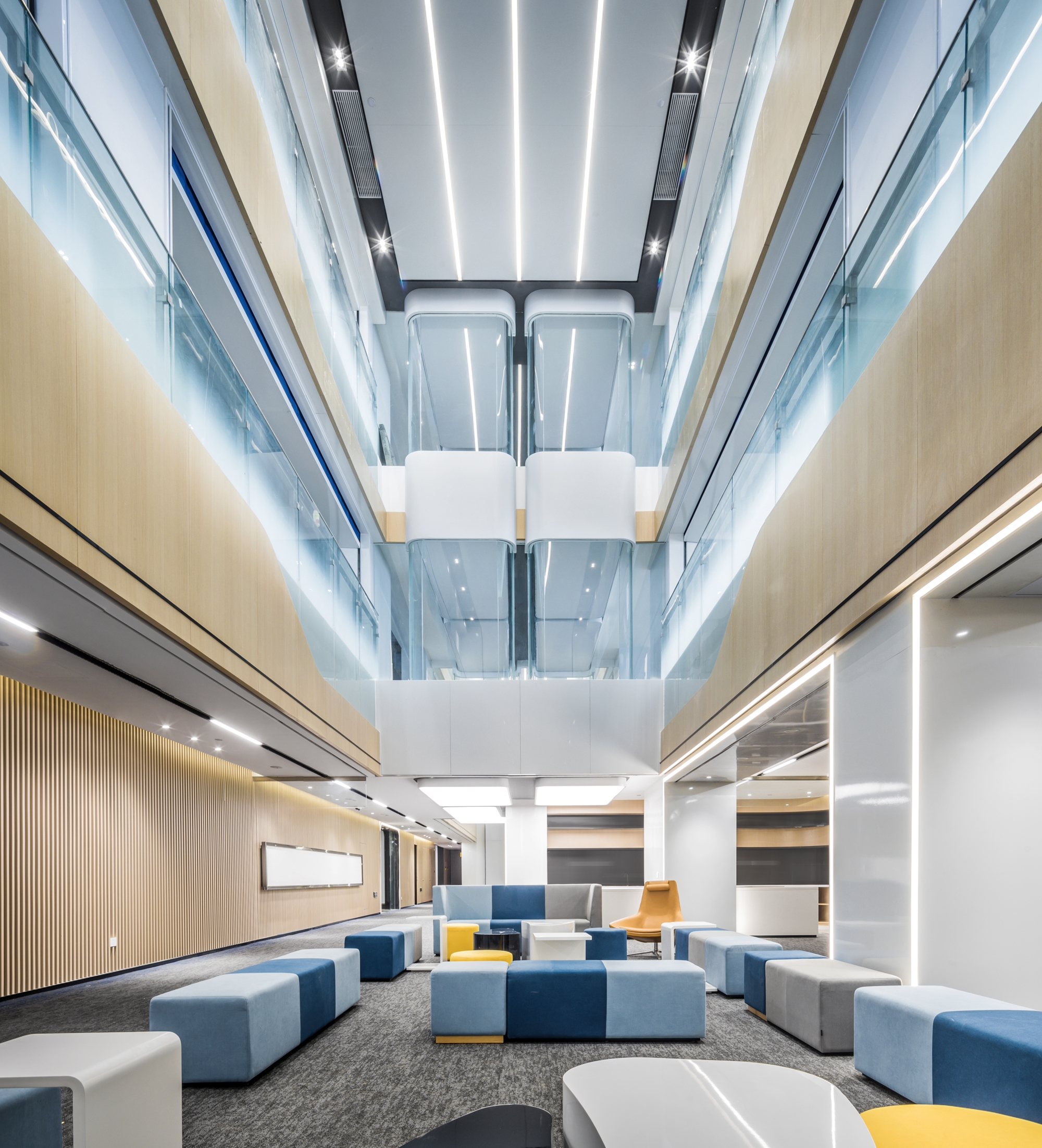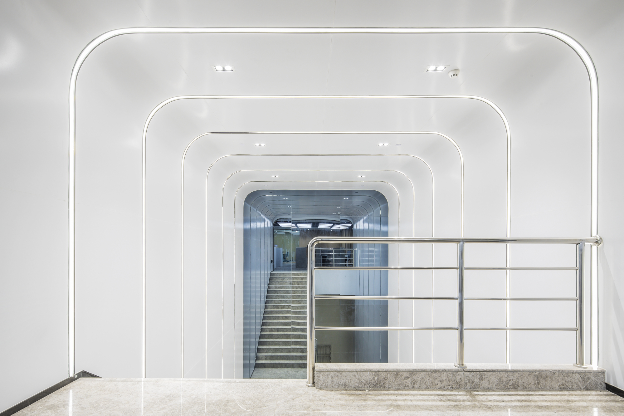 用户体验:中庭链接走廊我们以“胶囊”的处理手法,垂直布置在整个空间之中,形成了富有未来感和科技感的空间。弱化建筑连廊在空间中的负影响。