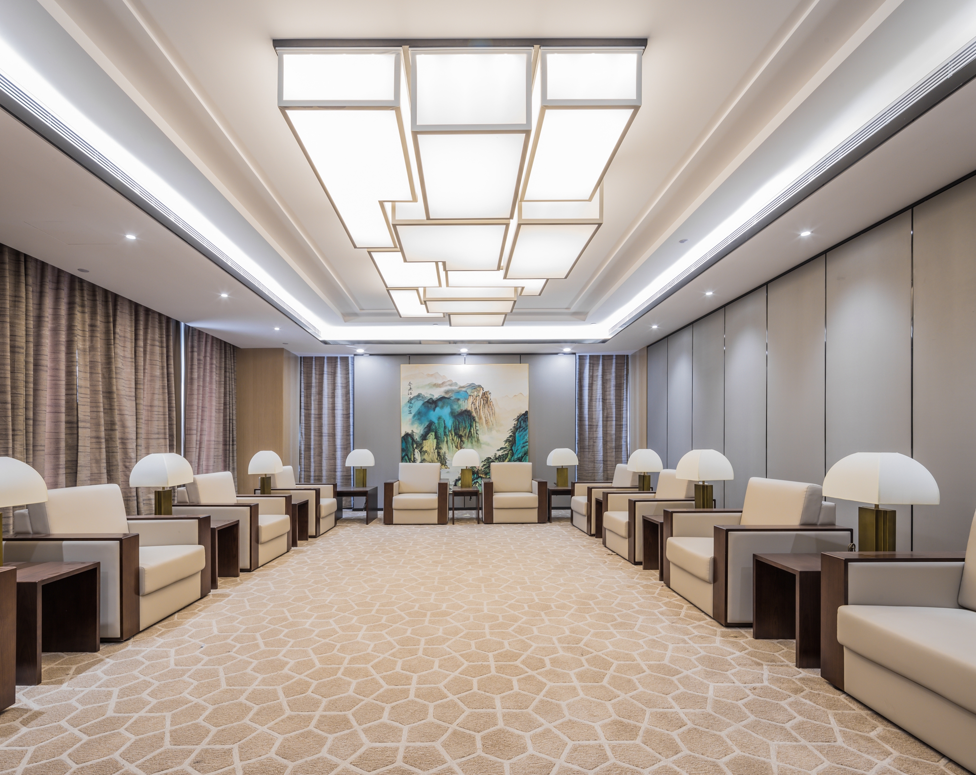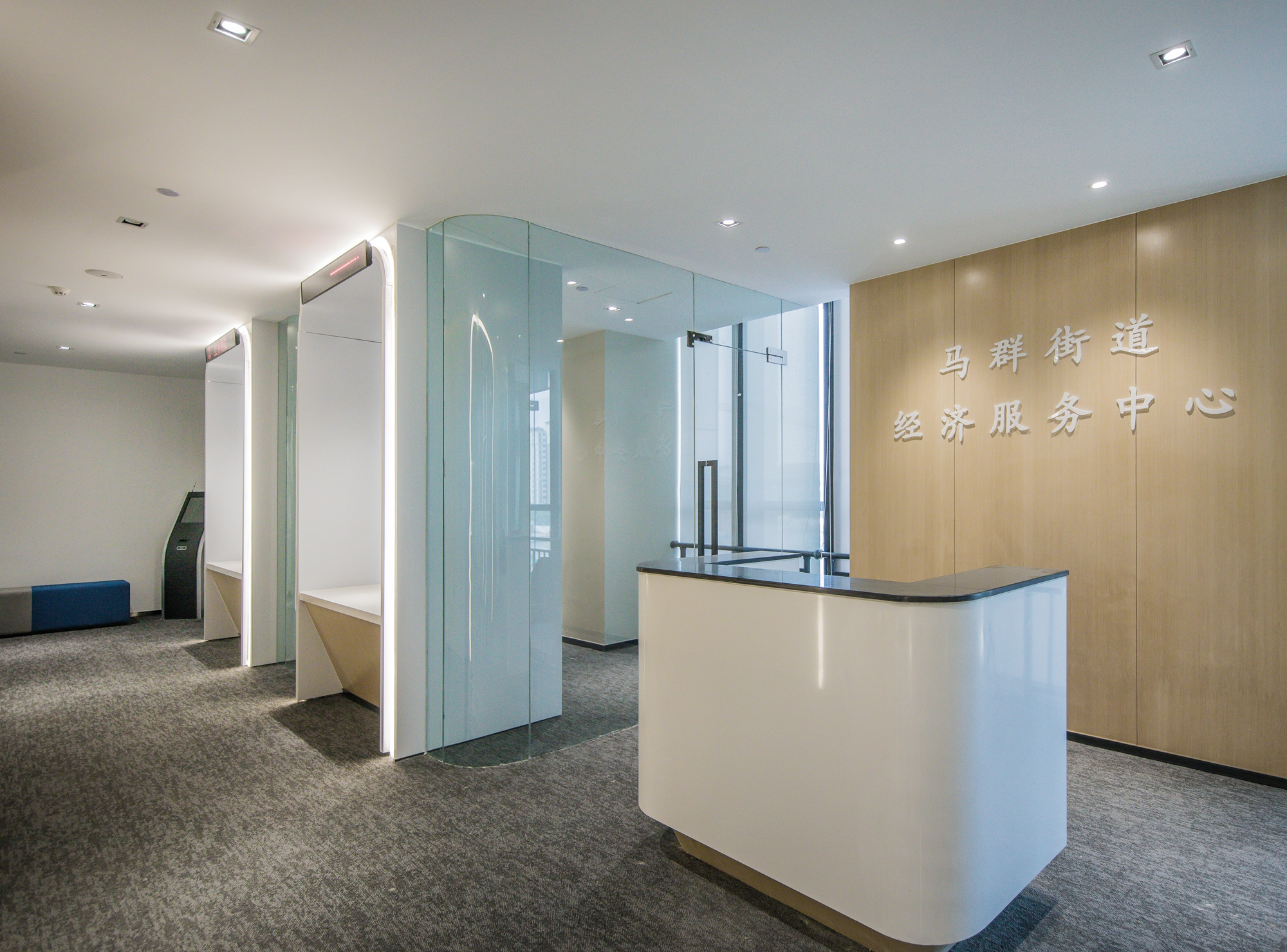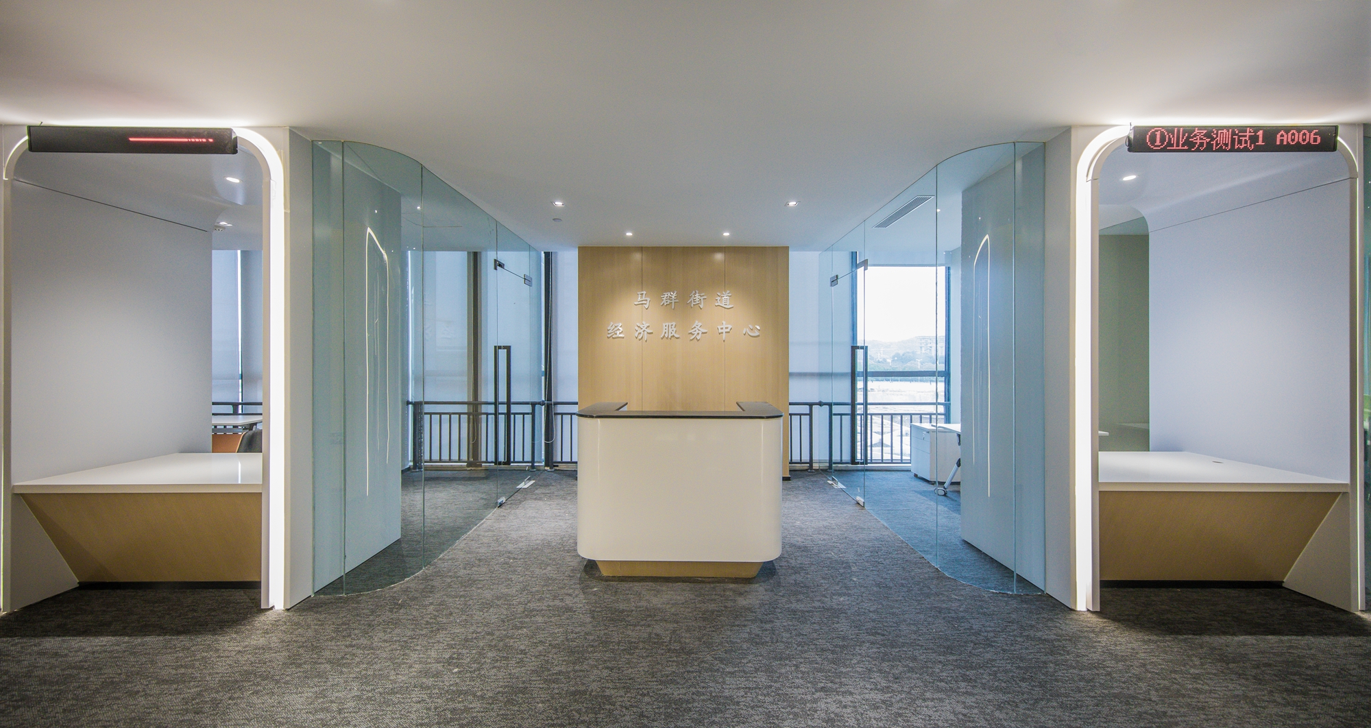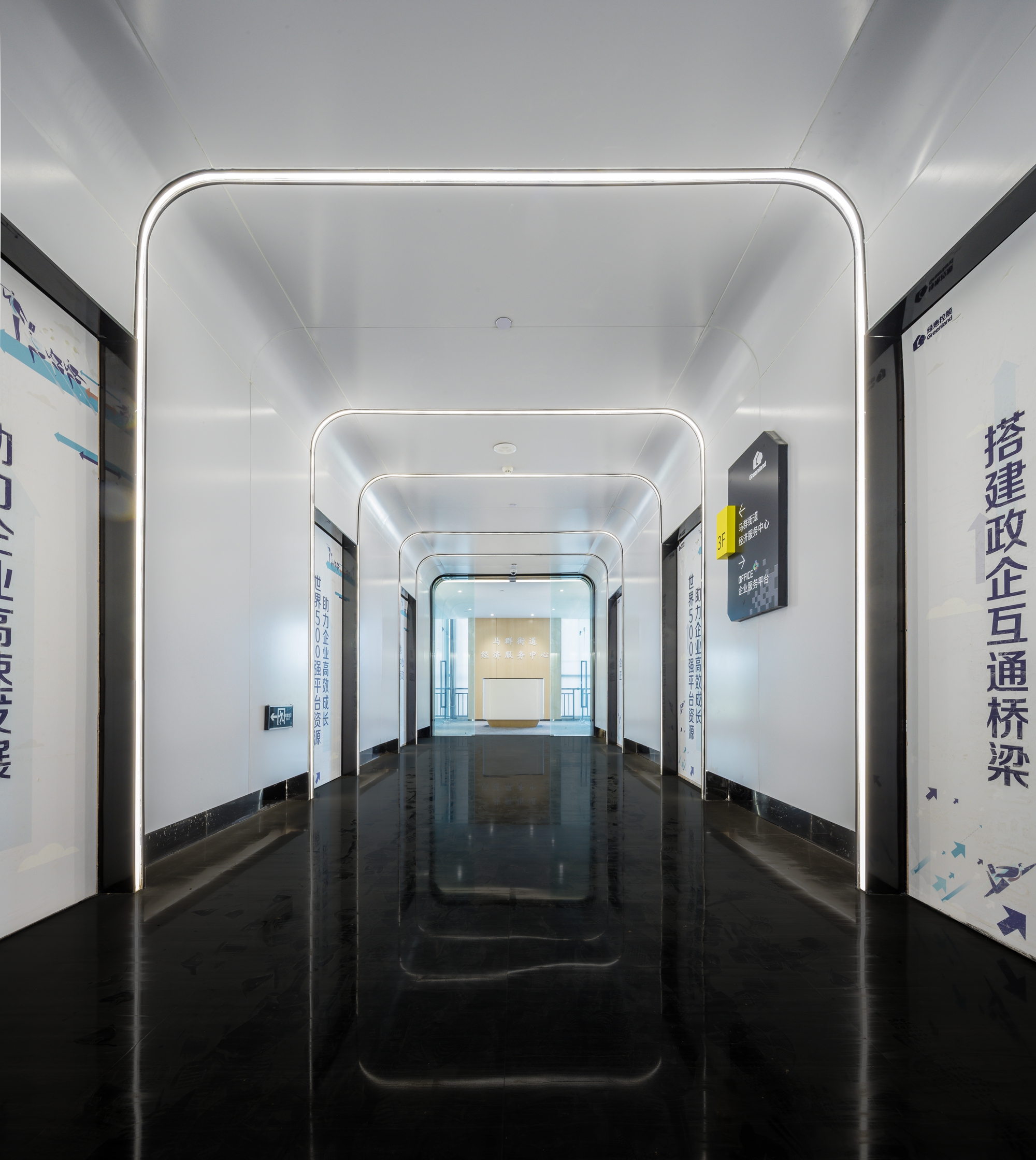 空间布局:前厅接待空间,作为企业形象的窗口,其钻石形态的超级前台,充满时尚和张力,半悬浮的姿态展现外在开放的精神。展现企业开放而向上的姿态精神。我们运用一个弧形穿插的设计手法把接待区,等候区以及企业展示区等功能空间连接在一起,并结合线性灯光,形成统一的立面体系。