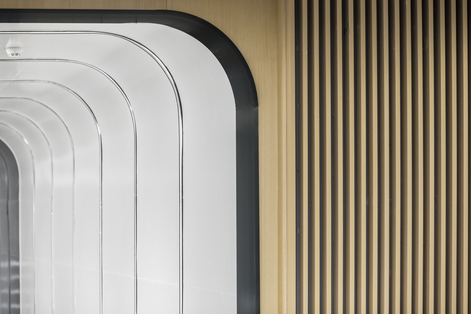 空间的互通和穿插让整个空间更加灵动,曲面造型勾勒出不同区域造型线条,点与线,线与面相互交汇,重叠,形成不同功能空间之间的艺术对话。 -