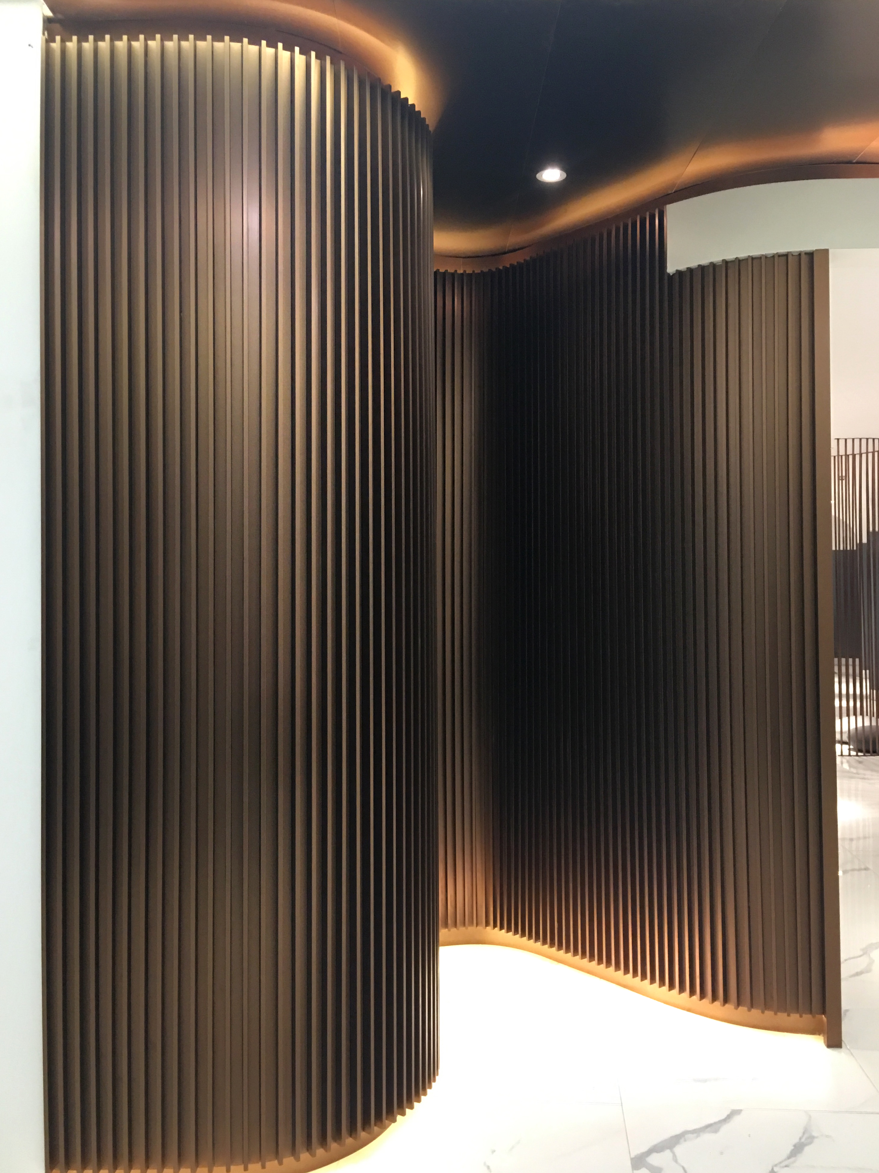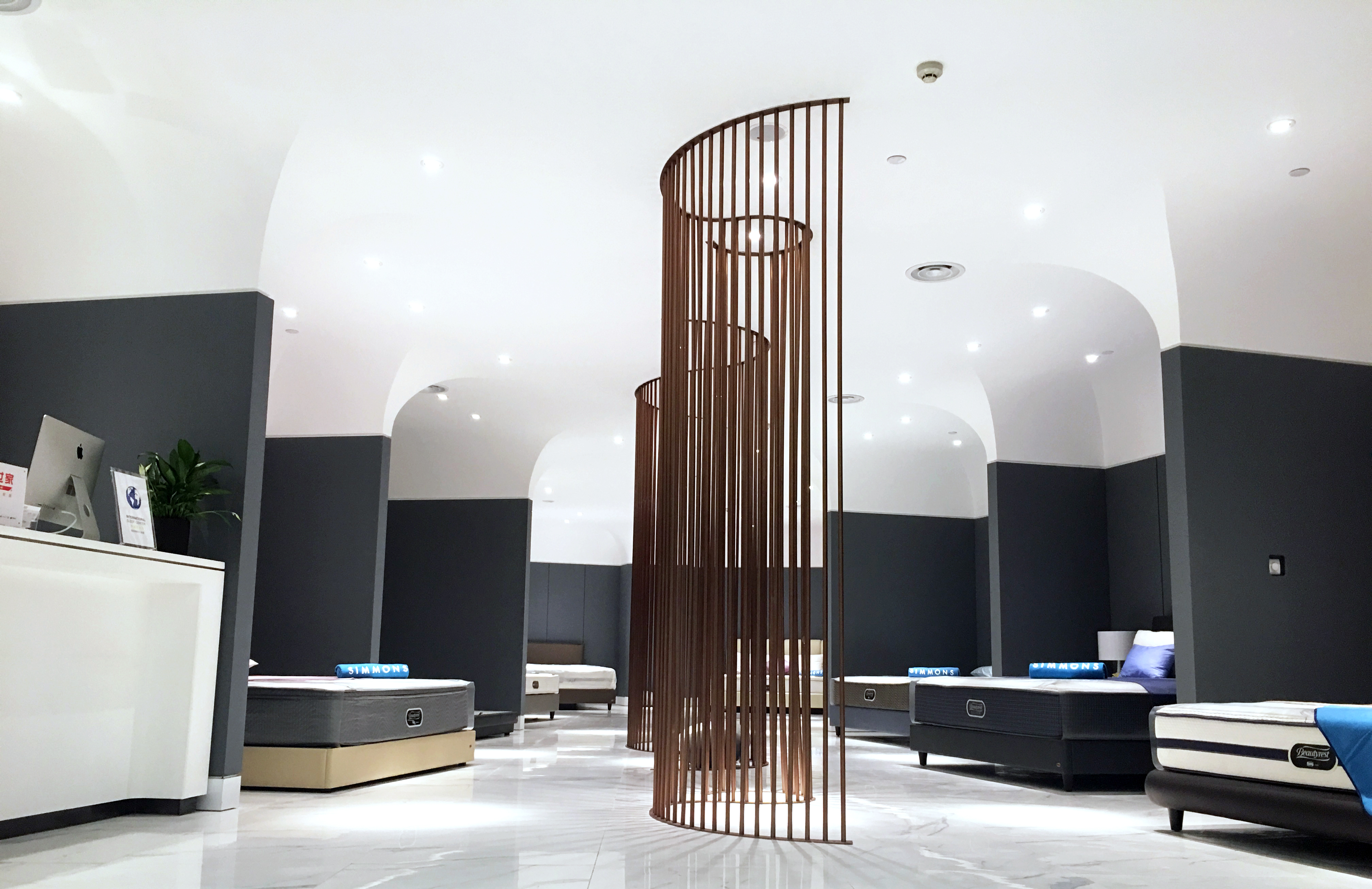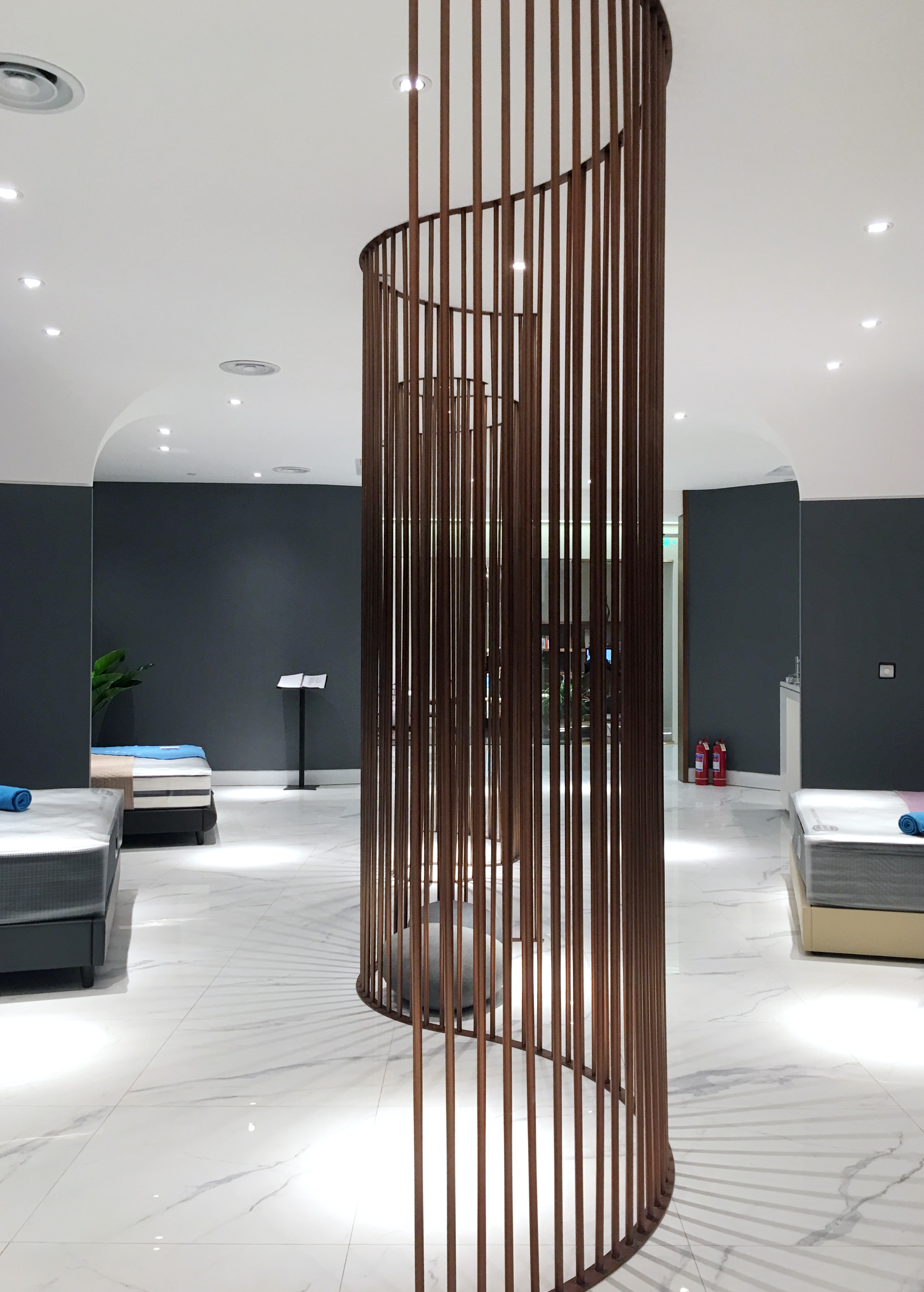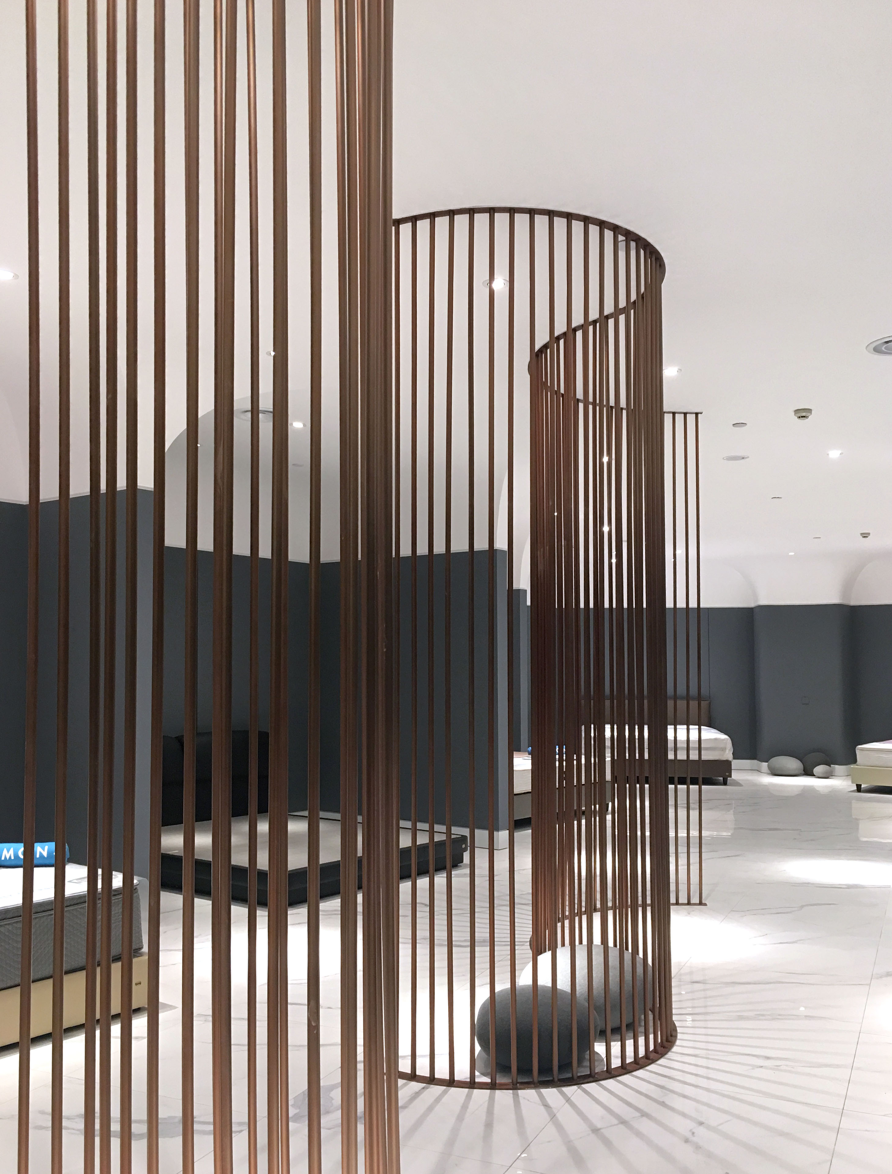 ∗弧形铜质隔断在空间中轴线处划出了一条完美的曲线,既代表了人体的弧线,也抽象提炼出了席梦思弹簧的舒适性 -