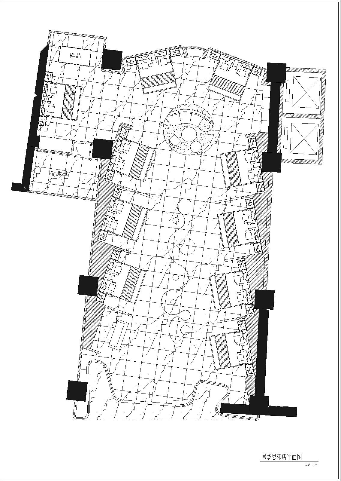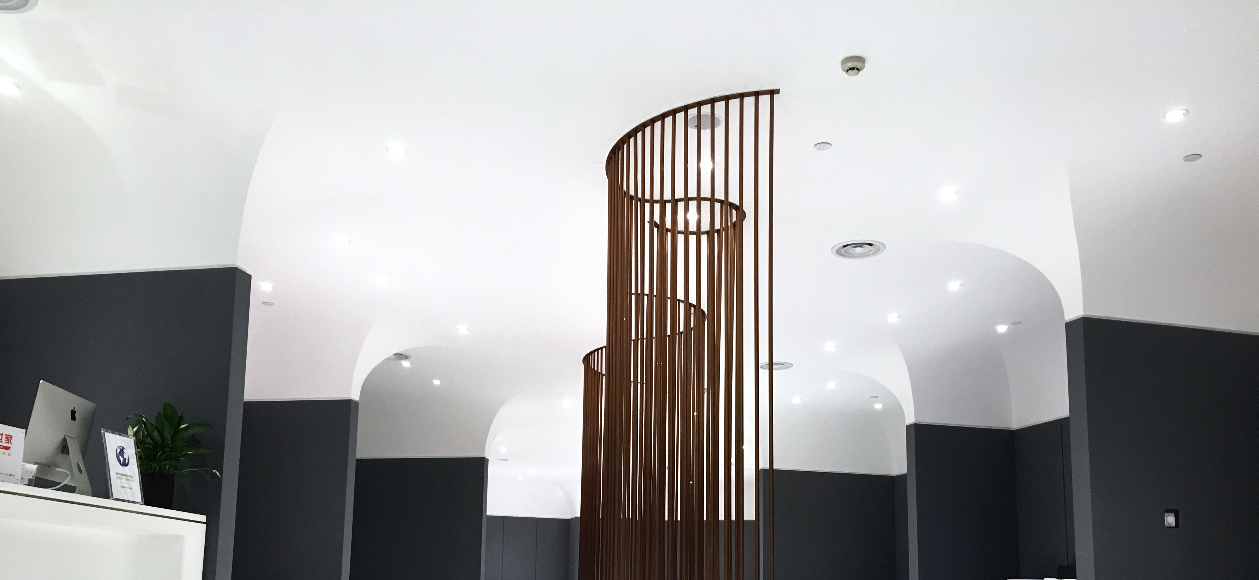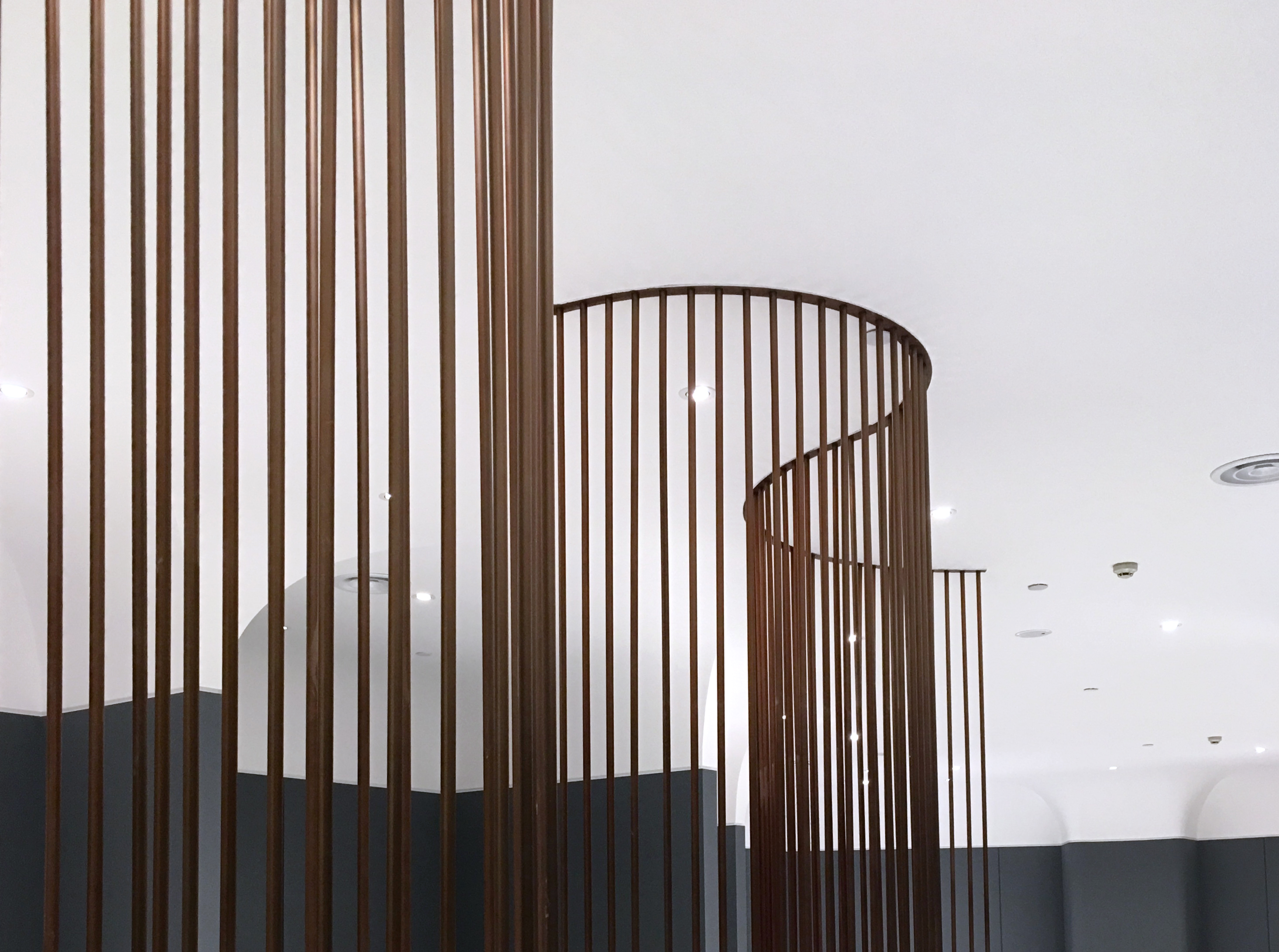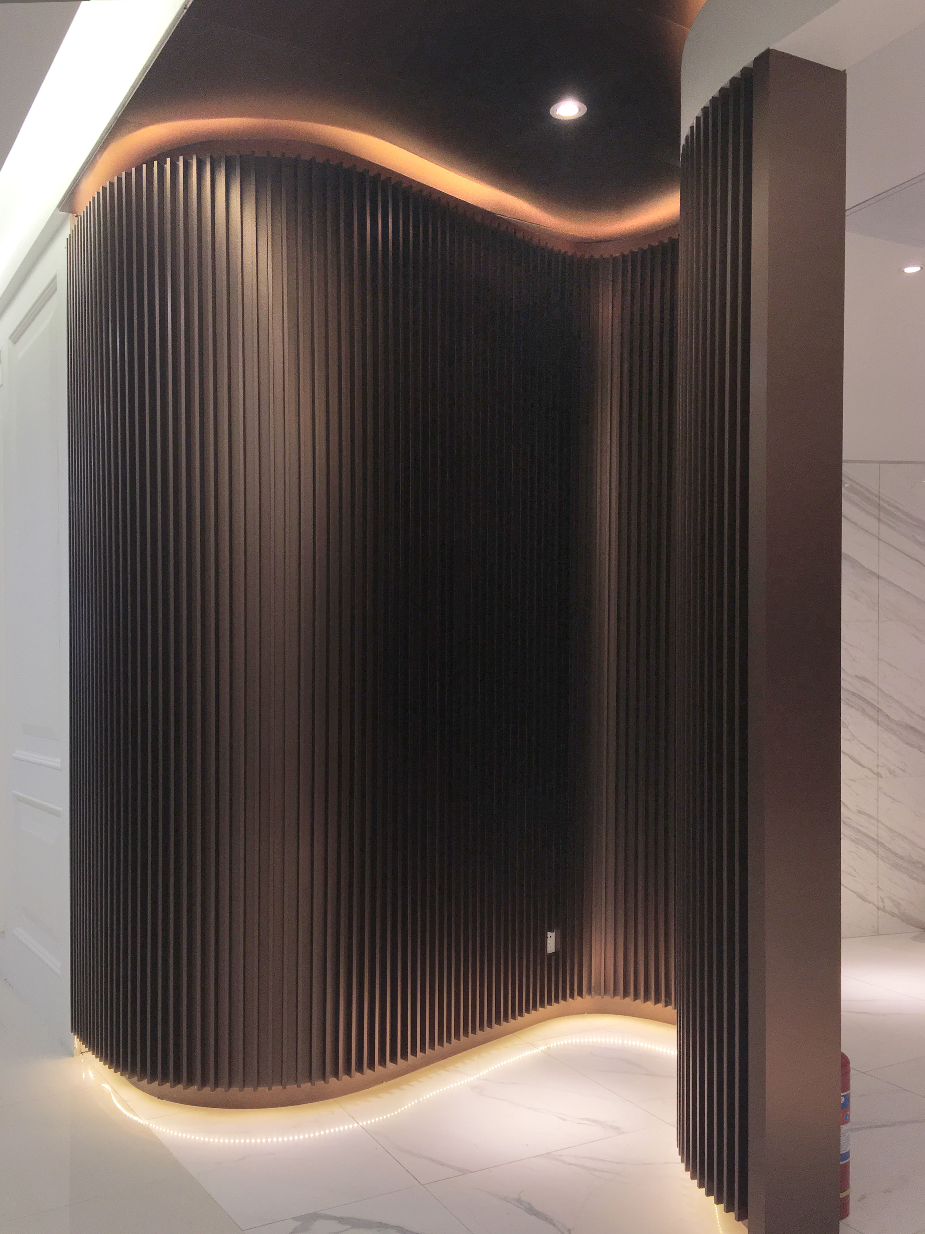 ∗弧形铜质隔断在空间中轴线处划出了一条完美的曲线,既代表了人体的弧线,也抽象提炼出了席梦思弹簧的舒适性 -
