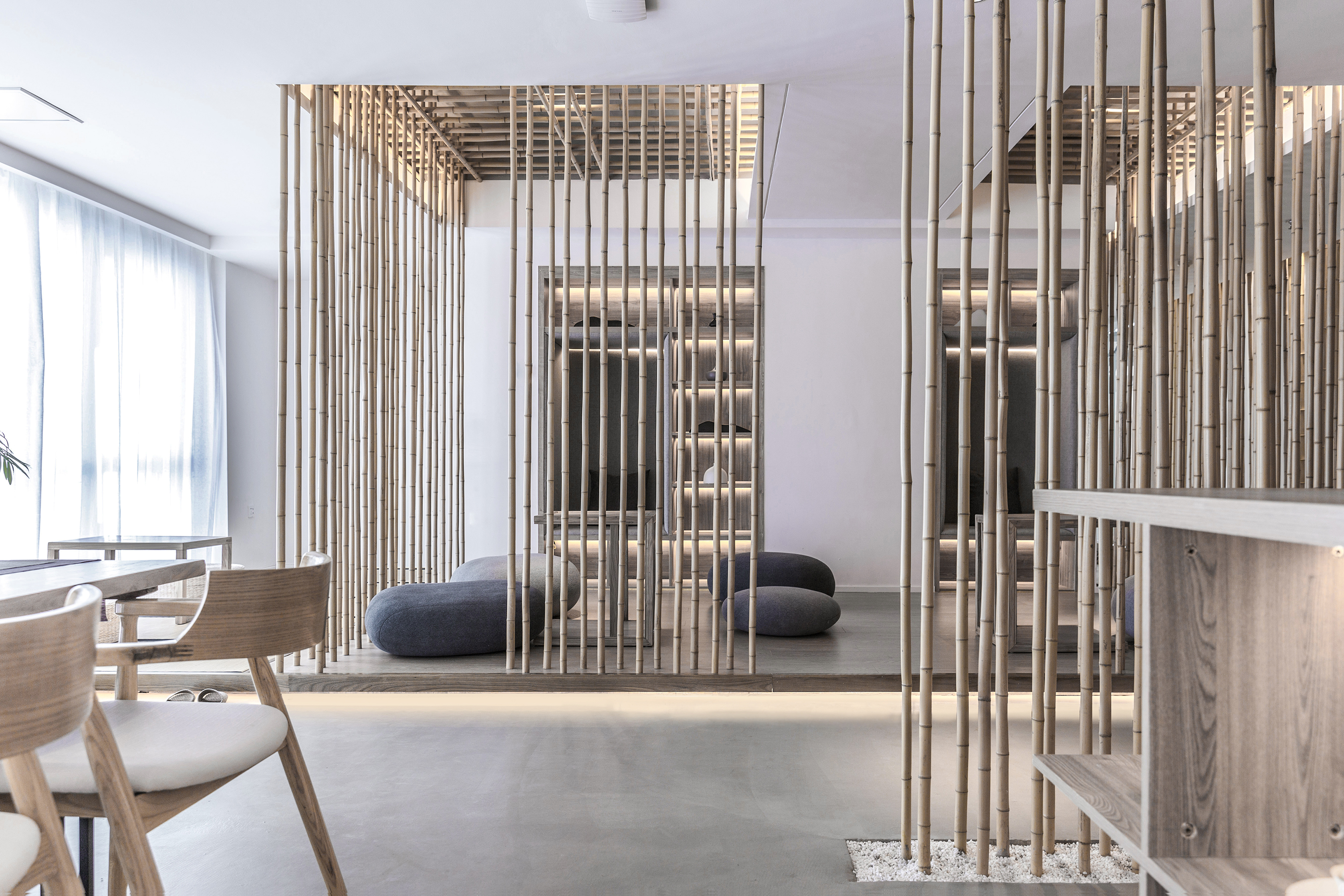 项目定位:瑜群空间位于江西南昌CBD红谷滩写字楼内,主要服务于喜爱瑜伽的都市白领,让人们找到心灵休憩的空间。本案以竹林为概念,旨在打造一个自然静谧的空间。希望每一个进入空间的人都能找到自己的心,找到人与人之间融洽的距离,找到打开心灵的钥匙。